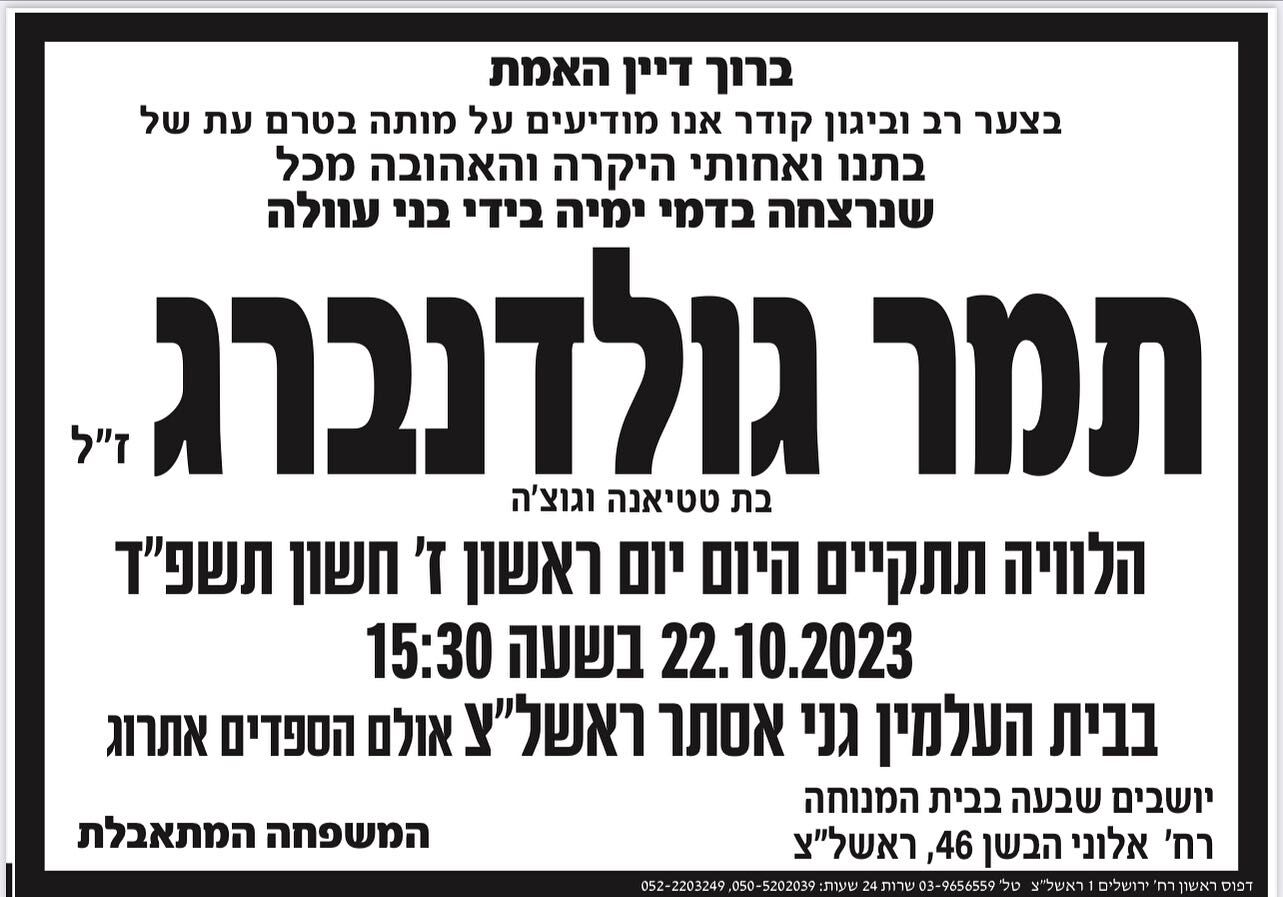 תמר תובא למנוחת עולמים היום ראשון 22.10 בבית העלמין גני אסתר