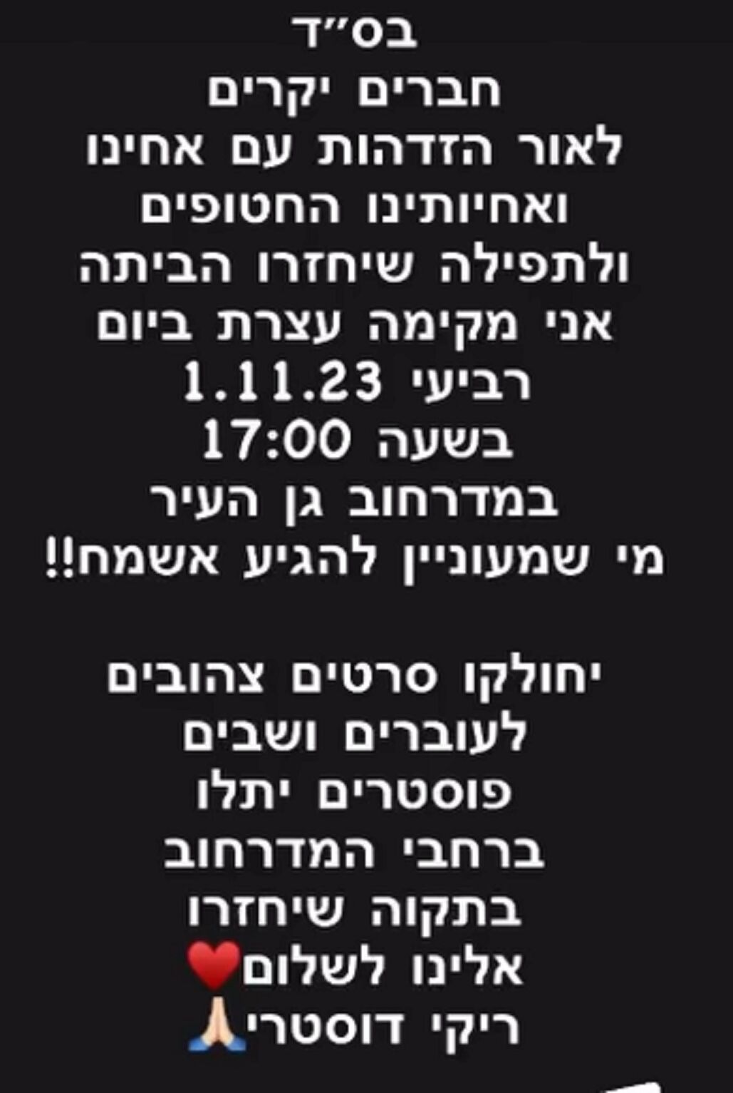ביום רביעי 1.11 הפעילה החברתית ריקי דוסטרי תקיים עצרת להזדהות עם משפחות החטופים במדרחוב רוטשילד