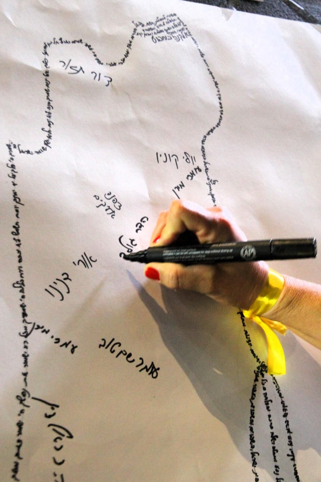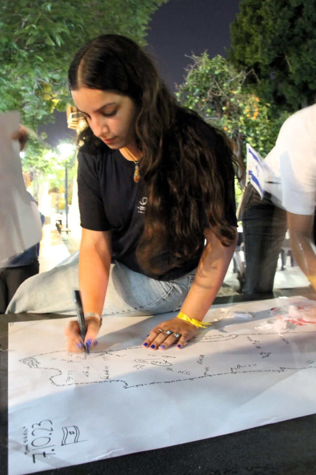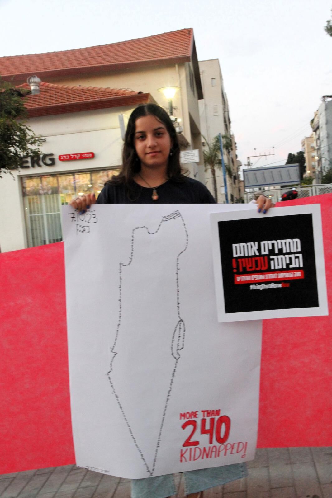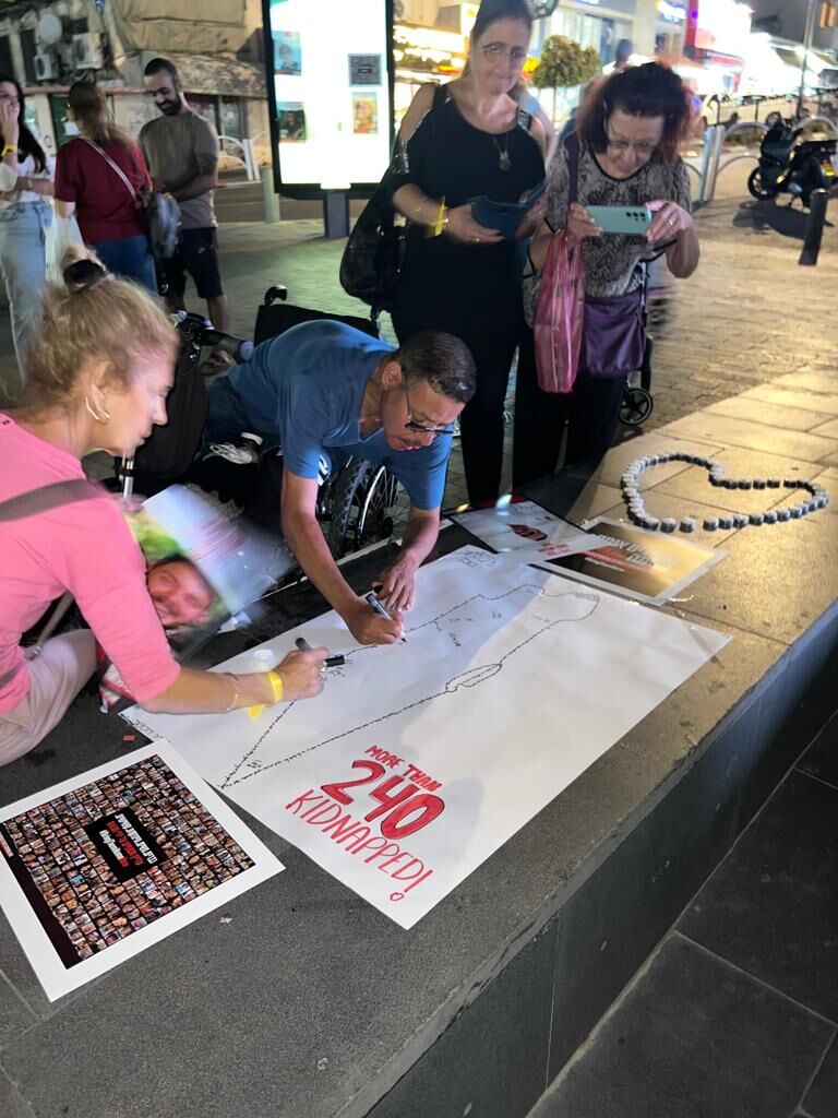 הפעילה החברתית ריקי דוסטרי קיימה אמש (רביעי) עצרת מיוחדת להזדהות עם משפחות החטופים במדרחוב רוטשילד. במהלך האירוע חולקו סרטים צהובים (שהפך לאחד מסמלי המאבק), נתלו תמונותיהם של החטופים בנוסף בתה של דוסטרי הציגה סמל ההזדהות כאשר ציירה את מפת א״י עם פסוקי תהילים מסביב ובפנים נכתבו שמות 240 החטופים .
