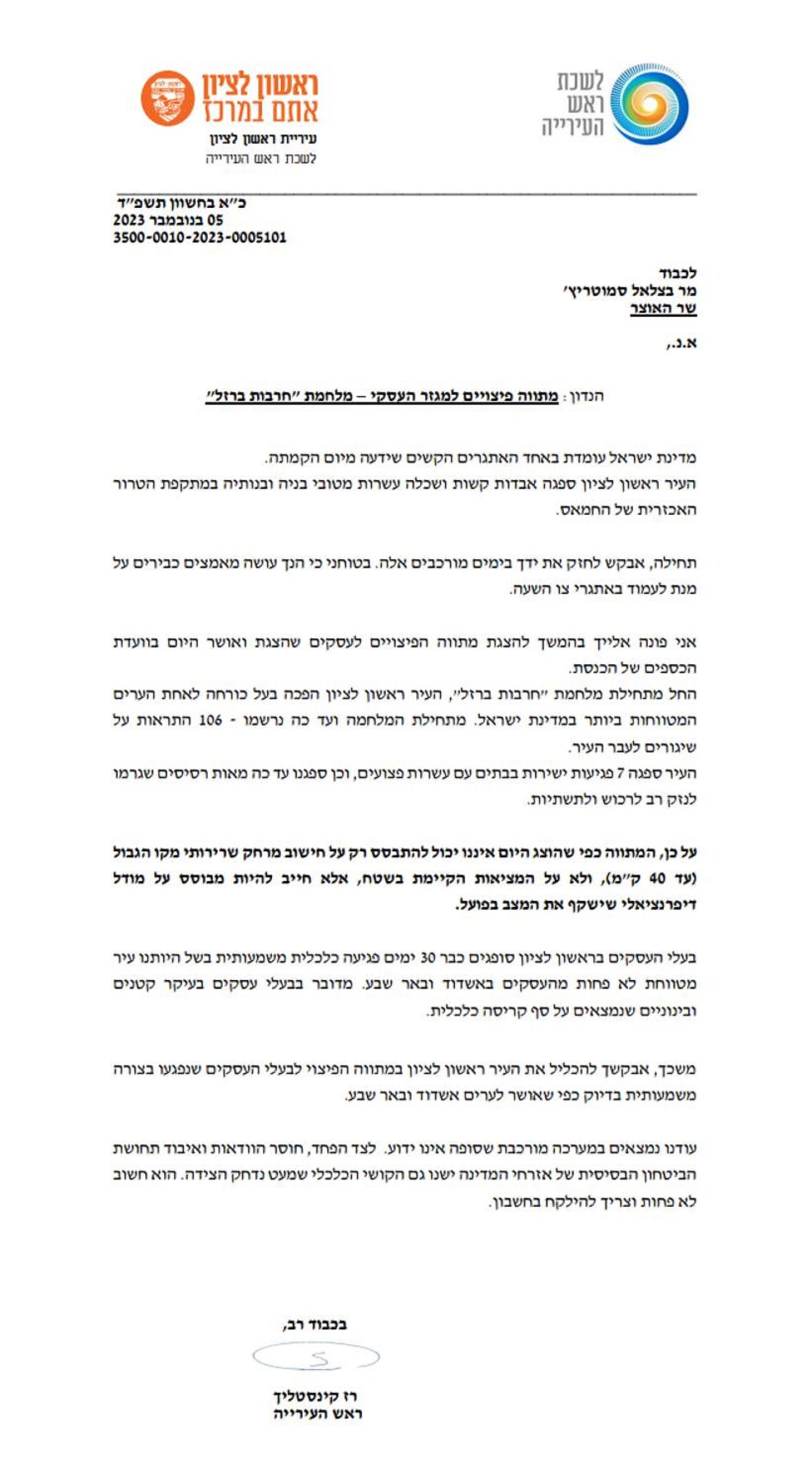 רז קינסטליך פנה לשר האוצר להכיל את מתווה פיצוי העסקים גם על ראשון לציון שהינה אחת מהערים המטווחות ביותר מאז תחילת הלחימה