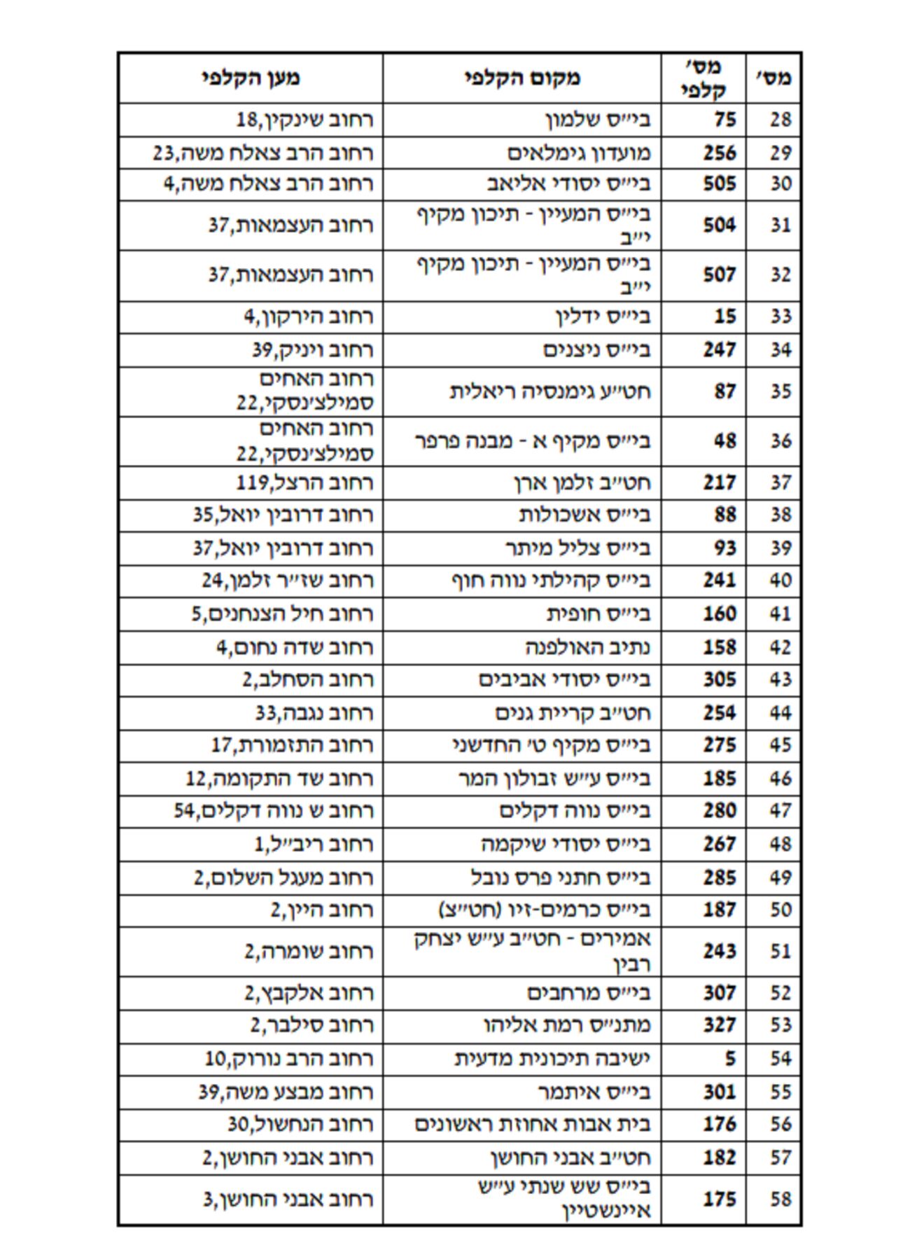 ירושלים, נתיבות (נגב מערבי), אשדוד, בני ברק, כפר סבא, פתח תקוה, ראשון לציון, עפולה, קריות.
