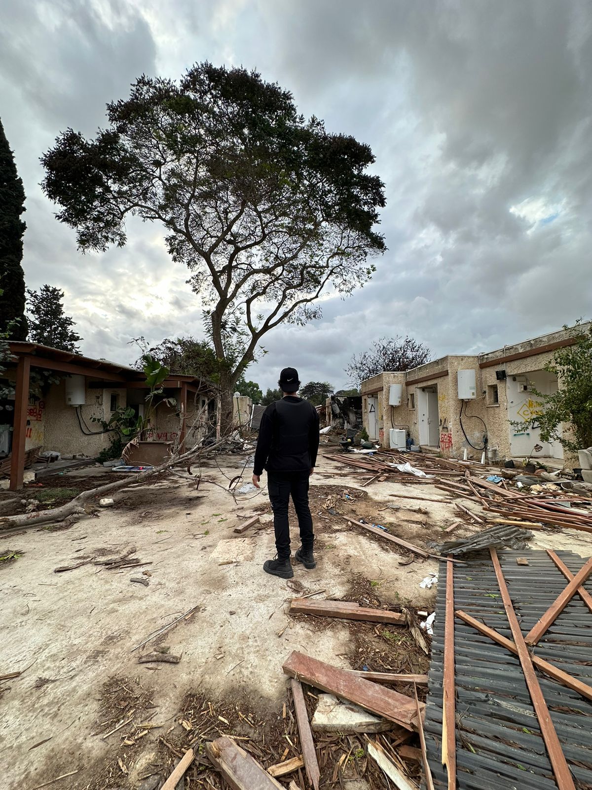 עוזרי מספר כי זה היה הביקור החמישי שלו במקום מאז שהחלה הלחימה. "כשנכנסים אתה חושב שאתה נכנס לקיבוץ אבל אז אתה מקבל גל ריח נורא של הדם, הרס הרג וכל המראות המזעזעים של הריסות, גן ילדים מושחת, המתקנים עם ניקוב כדורים, פיצוץ מכוניות. בביקור הראשון שלי עדיין היו גופות של בעלי חיים מפוזרות בדרכים. בחיים לא חשבתי שאראה מראות כאלו שרואים רק בסרטים ובארצות אחרות אבל אז אתה קולט כי זה קרה כאן אצלנו".