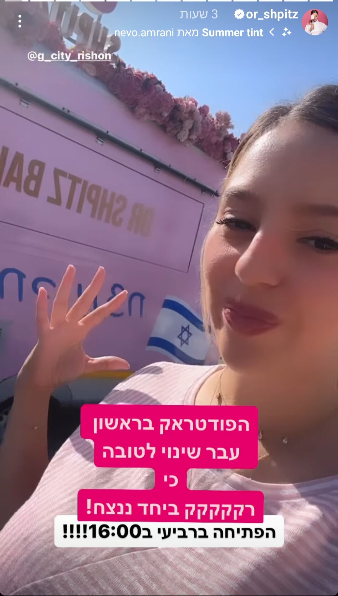 בפוסט שהעלתה בעמוד האינסטגרם שלה כתבה : "התלבטתי אם לפתוח פודטראק במקום החדש אליו יועד והחלטתי שהחמאס לא ישנה לנו תוכניות למרות שהחיים שלנו השתנו, ובטח לא ייקח לנו את הזכות להיות עם חופשי בארצנו. בשביל השפיות שלי ומניחה שיש לא מעט כמוני שהשגרה והעשייה עוזרת להם, אז אני פותחת פופאפ בחצי השנה הקרובה במקום מקסים שאני אוהבת במיוחד בסינמה סיטי ראשון לציון.
