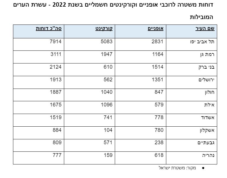 העיר תל אביב נמצאת במקום הראשון עם 7,900 דוחות שנתנו לרוכבים בשנה האחרונה.