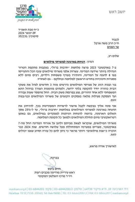 משרד הפנים הוא הגורם בעל הסמכות לאישור הנחה זו, והבקשה נתמכת בתקווה שתאושר בהקדם. קינסטליך מביע תקווה לשובם המהיר ולשלום של כל החיילים והחיילות, החטופים והנעדרים, ושולח רפאה שלמה לחיילים הפצועים המאושפזים בבתי החולים.