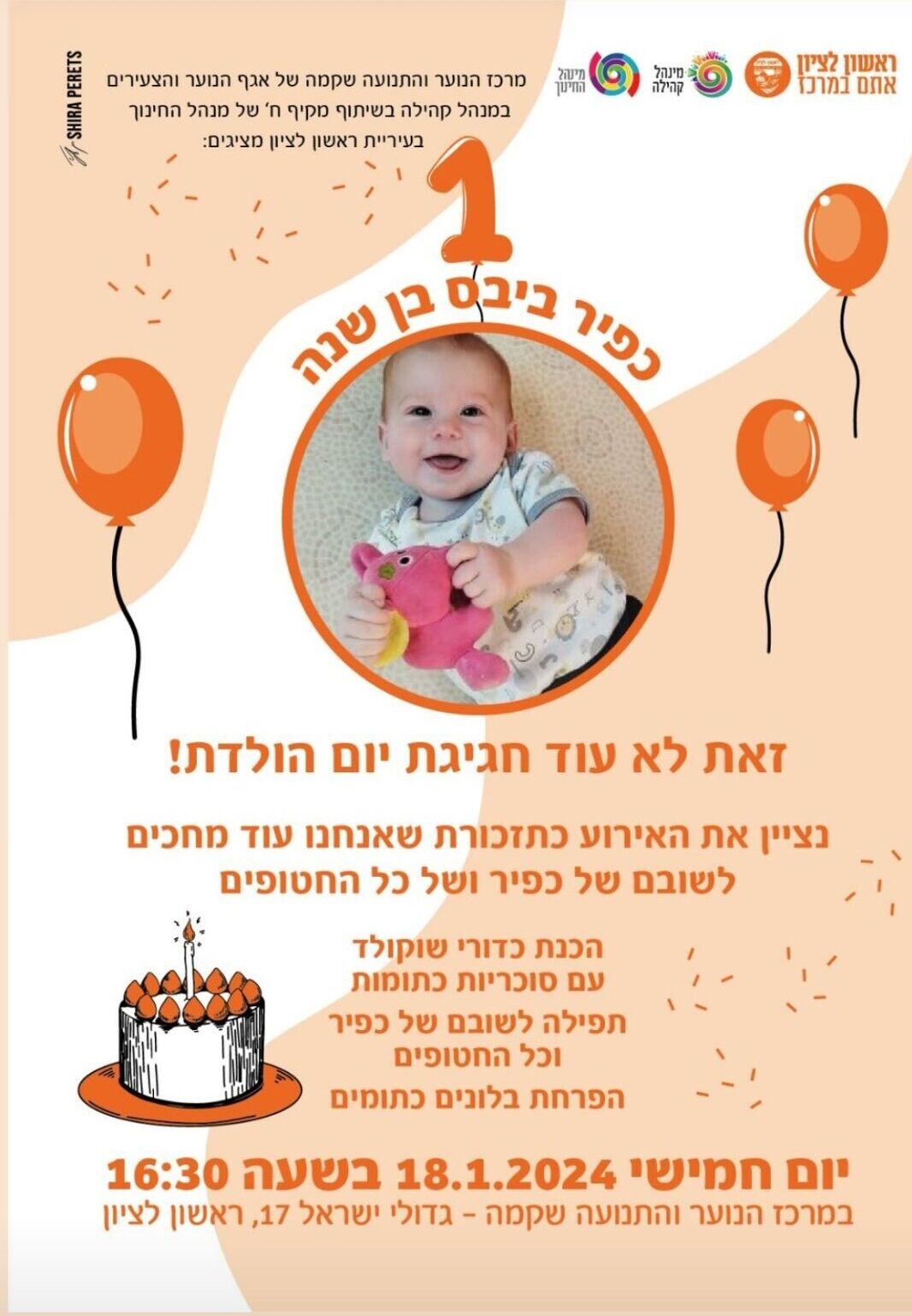 יום הולדת שנה לכפיר ביבס! היום חמישי 18.1 יתקיימו פעילויות בראשון לציון במדרחוב רוטשילד ובמרכז הנוער והתנועה שקמה לציון יום הולדתו של כפיר ביבס הנמצא עדיין בשבי החמאס