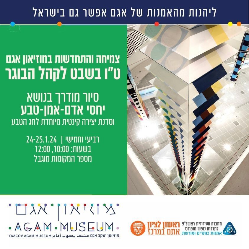 בתאריכים 24-25 בינואר, בין השעות 10:00 ל-14:30, יתקיים סיור מודרך בנושא יחסי אדם-אמן-טבע וסדנת יצירה קינטית מיוחדת לחג הטבע, מיועד לקהל הבוגר.