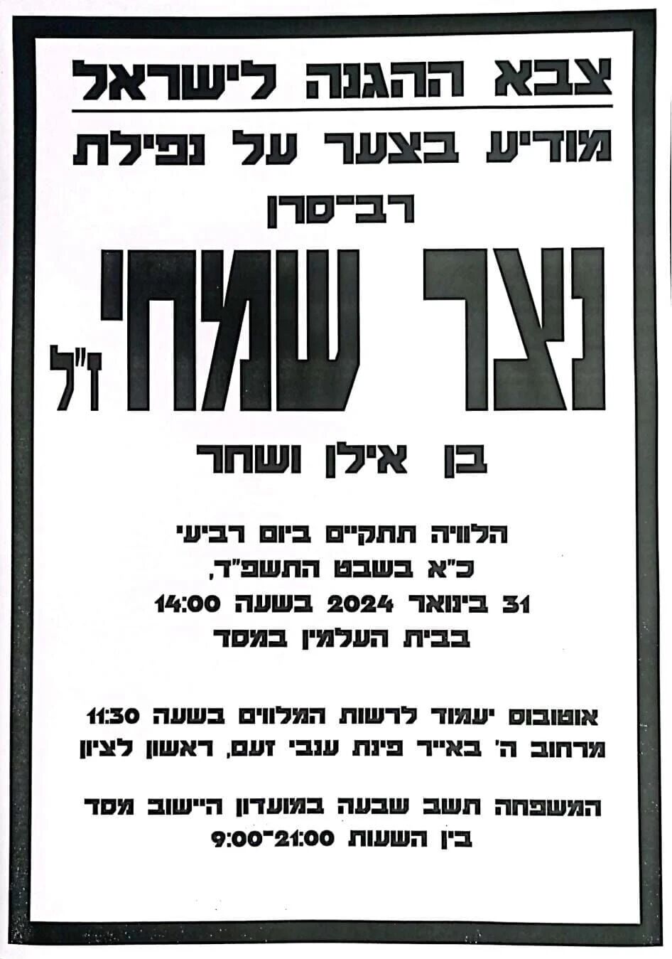 רס"ן (במיל') נצר שמחי ז"ל מראשון לציון נפל בקרב סודי ברצועת עזה... בהודעת דובר צה"ל נמסר שהחלל ממושב מסד בגליל התחתון