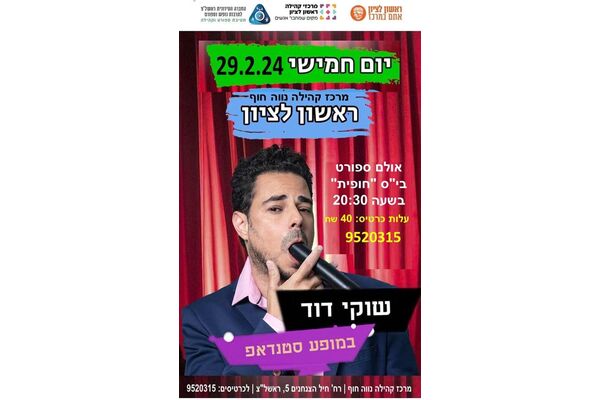 ביום חמישי 29.2 יתקיים באולם ביה"ס חופית בראשון לציון מופע הסטנדאפ של שוקי דוד