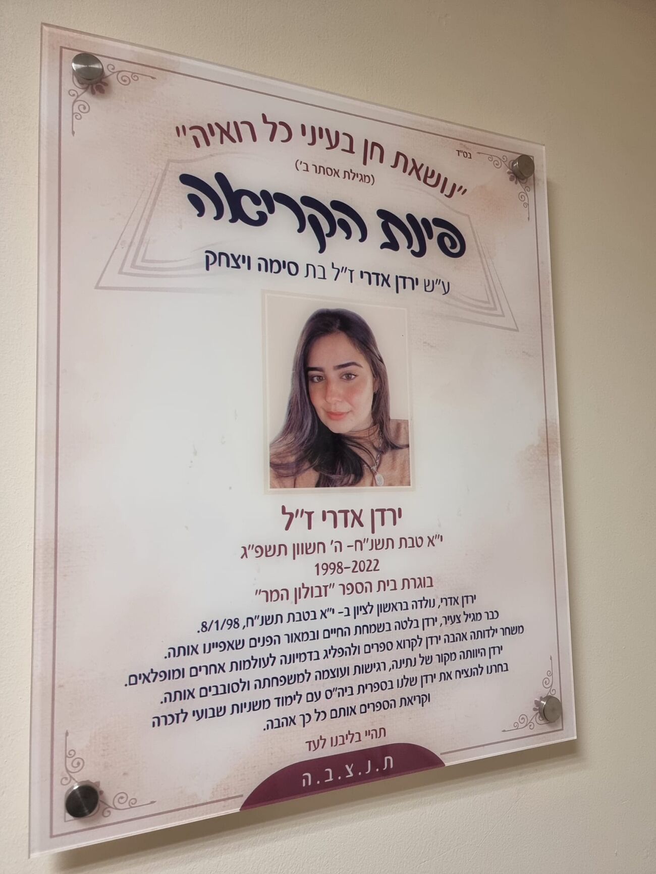 בית ספר זבולון המר בראשון לציון חנך את פינת הזיכרון לזכרה של ירדן אדרי ז"ל בספריית בית הספר