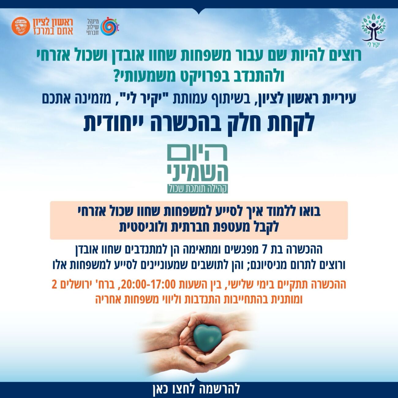 במקביל, האגף לפיתוח שירותים חברתיים, בשיתוף עמותת "יקיר לי", מרחיב את התמיכה במשפחות השכול האזרחי ומציע הכשרה מיוחדת לתושבים שחוו אובדן בעצמם או לתושבים שמעוניינים להוות מעטפת תמיכתית.