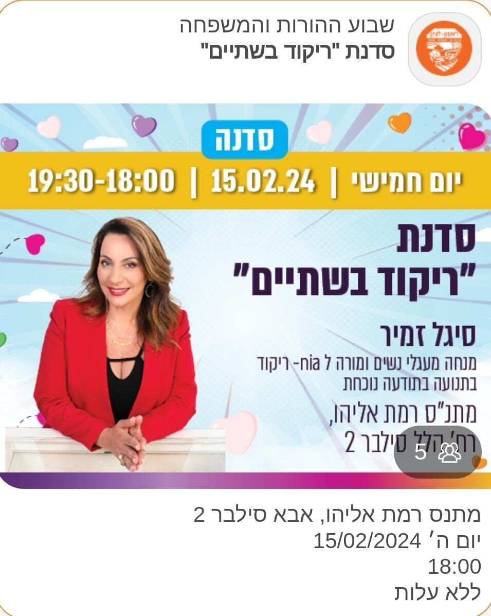 עיריית ראשון לציון מזמינה את הציבור להשתתף בסדנת "ריקוד בשתיים" לאמהות ובנות בגילאי 12-14, במסגרת שבוע ההורות והמשפחה. הסדנה תתקיים ביום חמישי, ה-15 בפברואר 2024, בין השעות 18:00 ל-19:30 במתנ"ס רמת אליהו, ותובל על ידי סיגל זמיר. ההשתתפות בסדנה אינה כרוכה בעלות.
