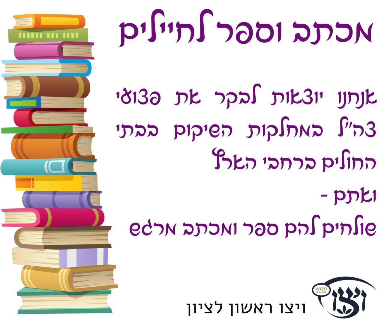 ויצו ראשון לציון מזמינה תלמידים וחיילים לרכוש ספר בספריית ויצו והספר בצירוף מכתב יועבר על ידי ויצו לחיילים פצועים