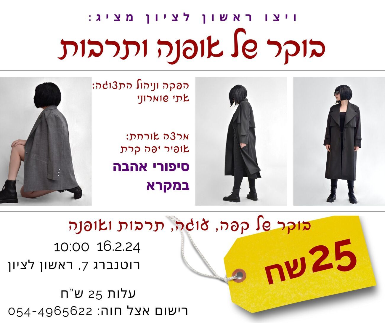 יום שישי 16/2 ויצו ברחוב רוטנברג 7 ראשון לציון החל מהשעה 10:00 בבוקר