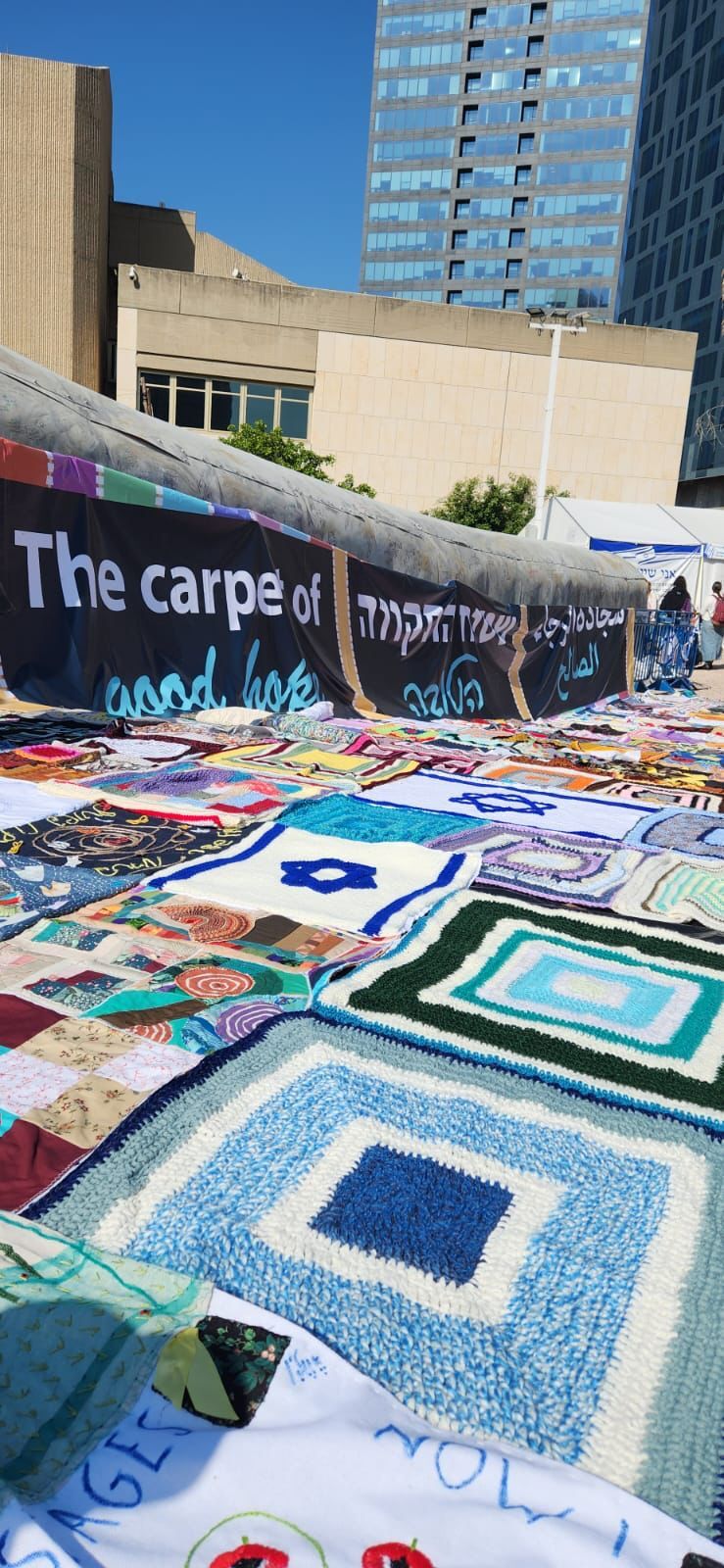 קבוצת הסריגה "ראשוניות סורגות" השתתפה במיזם "שטיח התקווה הטובה" שהוצב בכיכר החטופים