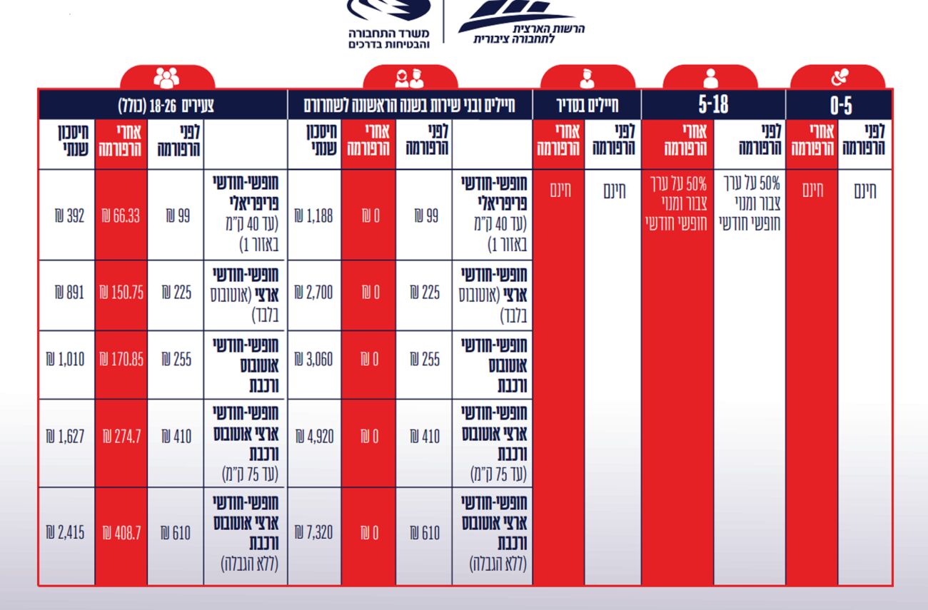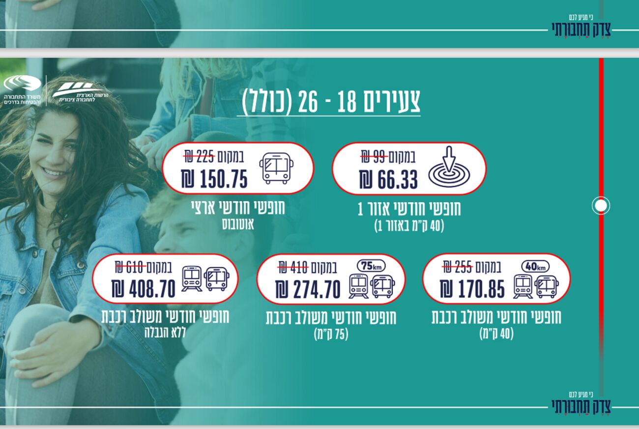 כך למשל חופשי חודשי ארצי לצעירים בני 18-26 יעלה 150.75 ש"ח במקום 225 ש"ח