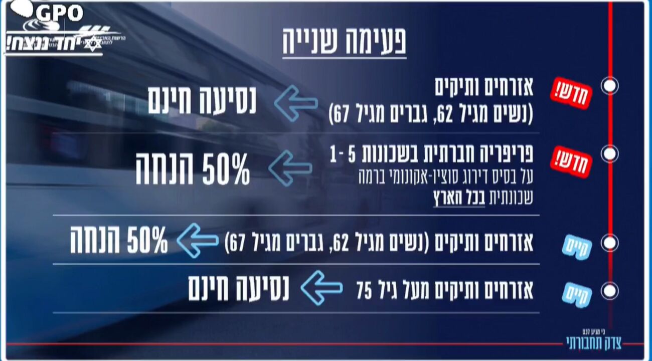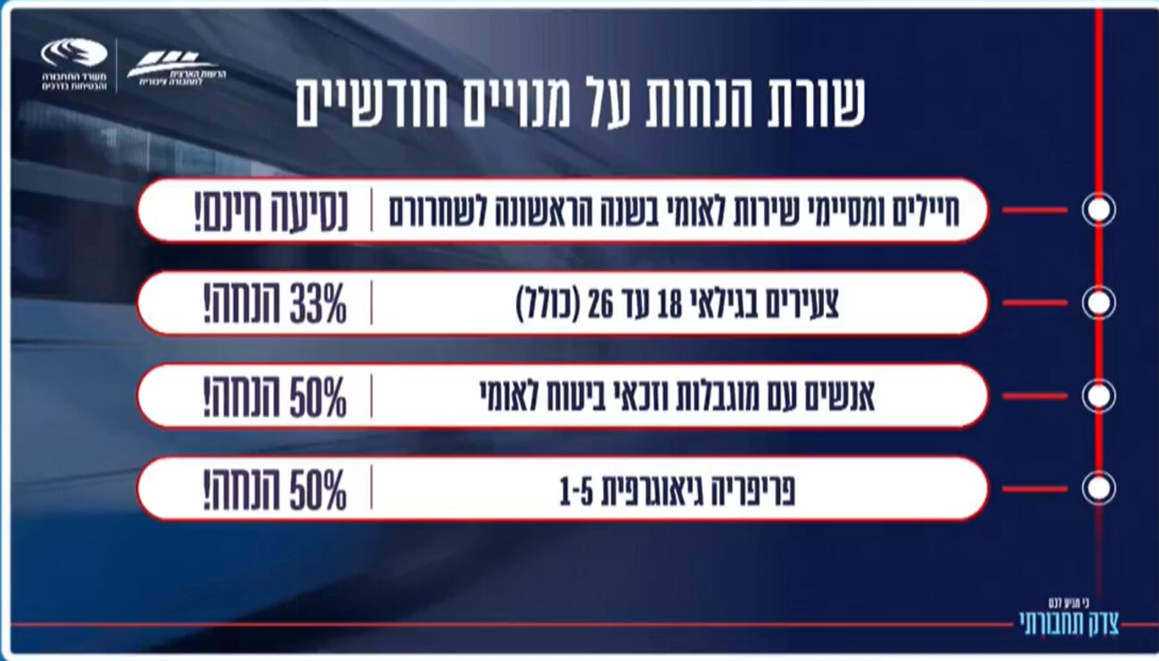 כך הודיעה היום השרה מירי רגב בהצגת רפורמת צדק תחבורתי אשר עתידה להעניק הטבות של 33% ועד 50% לצעירים, תושבי הפריפריה ונסיעות חינם לאזרחים ותיקים ולחיילים משוחררים.