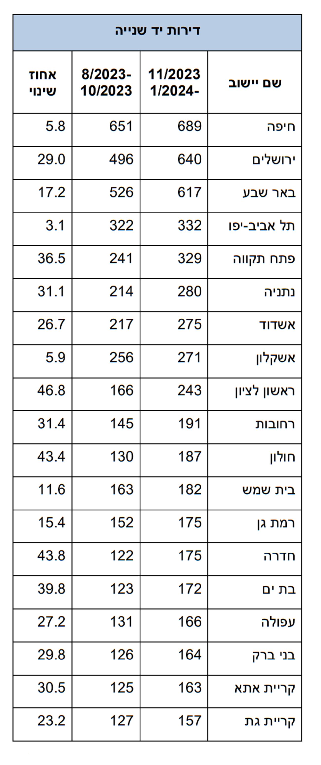 כאשר מסתכלים על הערים בישראל ירושלים ואשדוד מובילות במספר הדירות שנמכרו בשלושת החודשים האחרונים עם יותר מ500 דירות. חיפה, ירושלים ובאר שבע הן הערים המובילות במכירת דירות יד שנייה.
