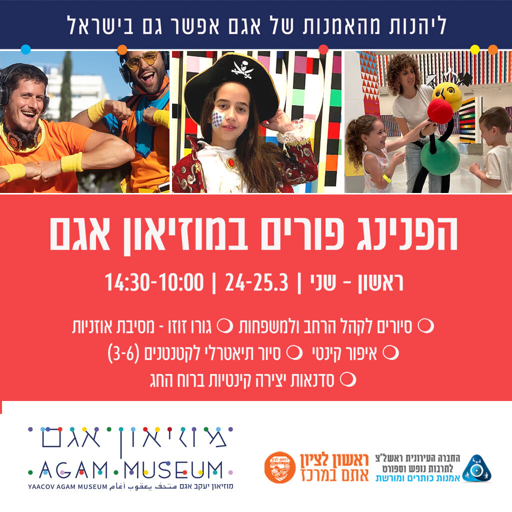הפנינג פורים בימים ראשון עד שני 24-25.3.24 משעה 10:00 הכולל הצגות ילדים, סדנאות צחוק, סדנאות יצירה וסיורים.