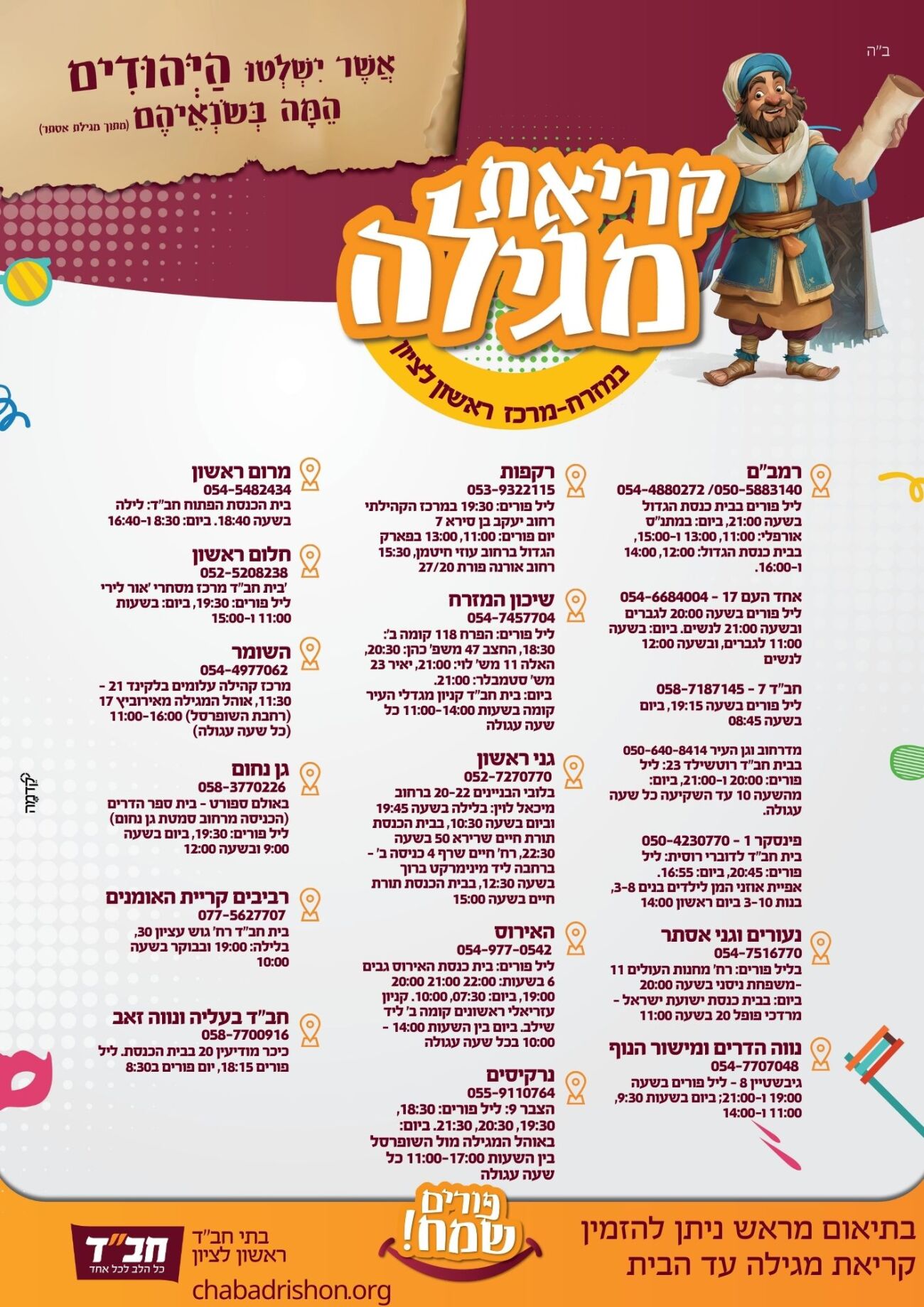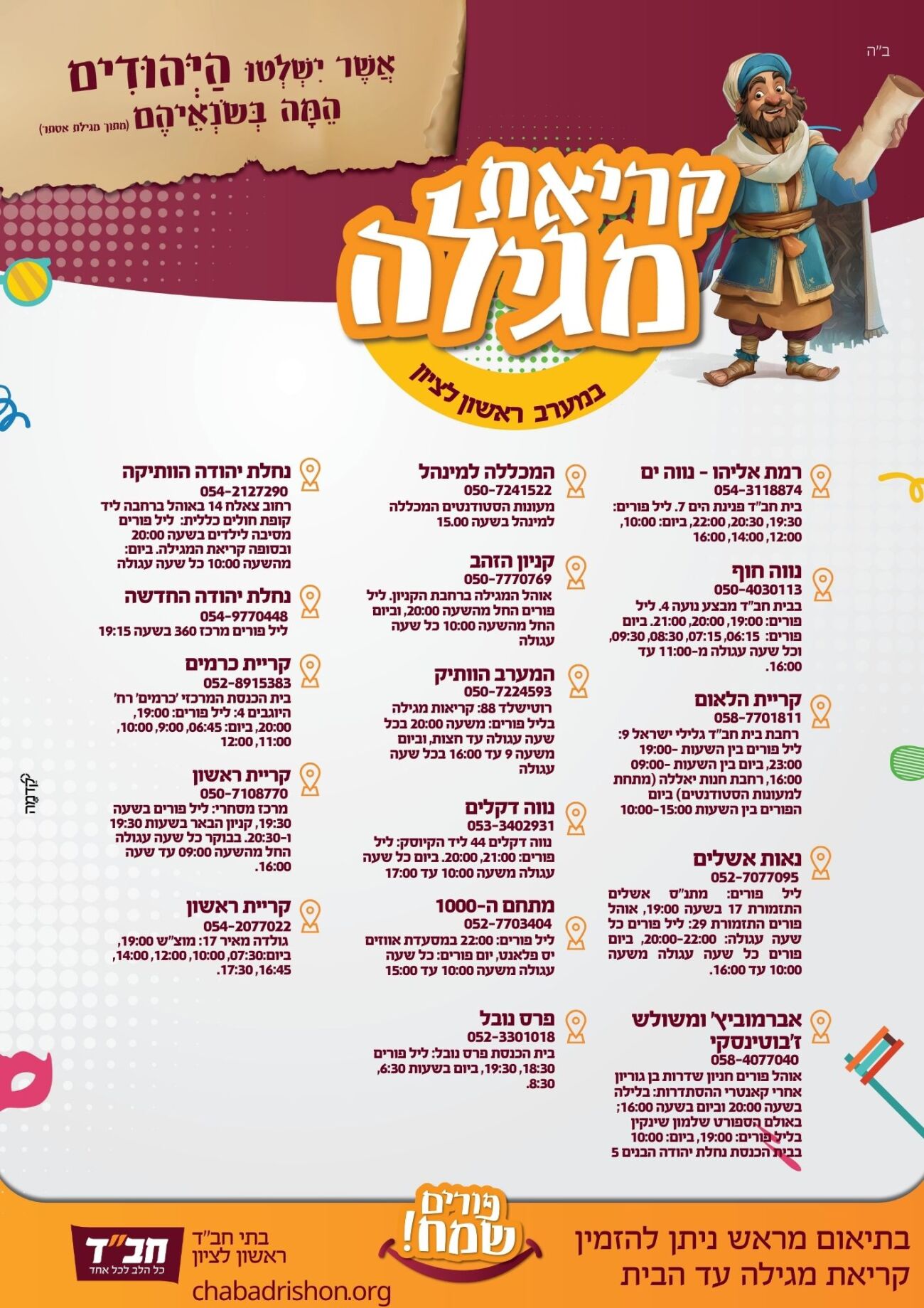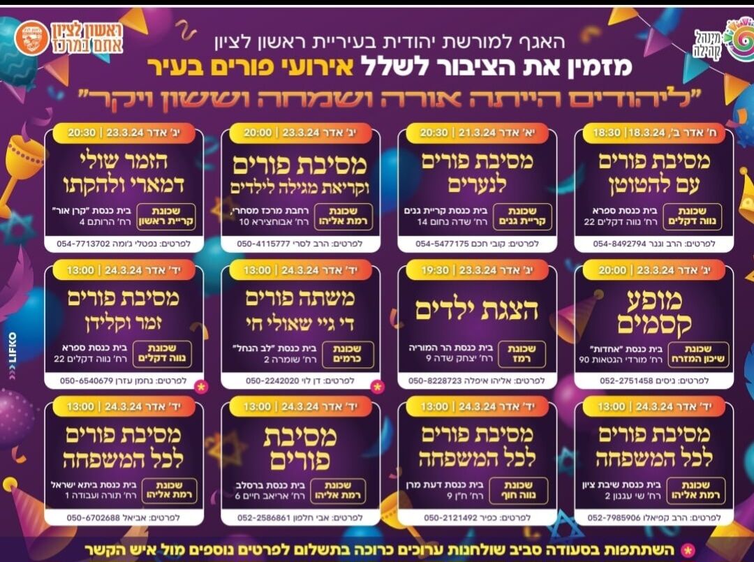 בנוסף יתקיימו חגיגות פורים בבתי חב"ד ברחבי העיר לפרטים נוספים נתין לפנות למנהלי בתי חב"ד https://chabadrishon.org/