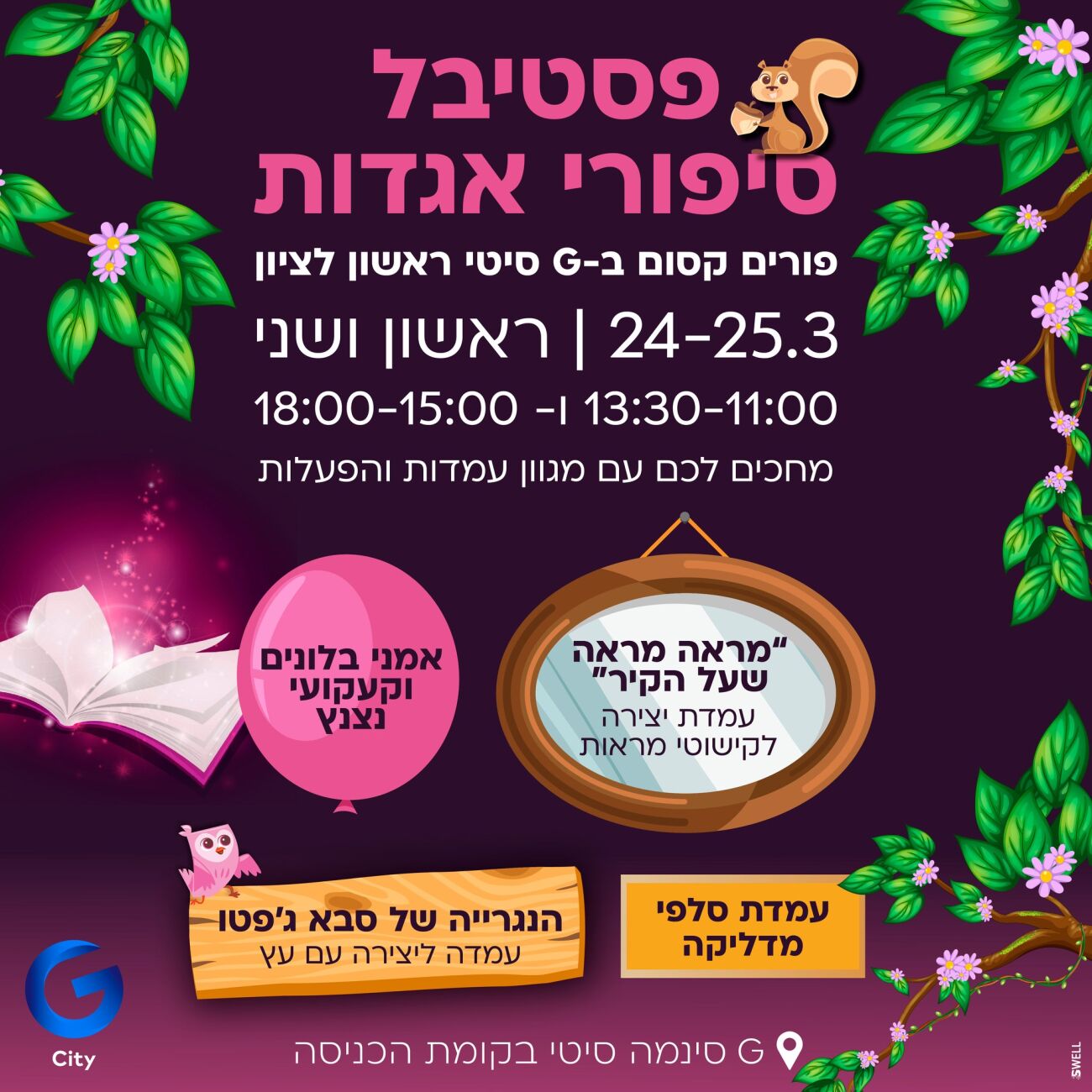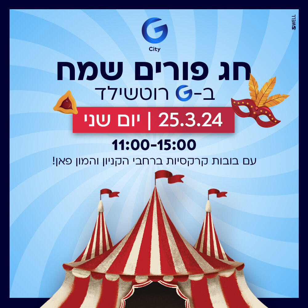 קבוצת G City מזמינה את הקהל לחגוג פורים באירוע צבעוני ומרהיב ב-G סיטי ראשון לציון. הפסטיבל, המתקיים ב-24-25 במרץ, יכלול עמדות יצירה לילדים ומפגשים עם דמויות מהאגדות האהובות על ילדים.