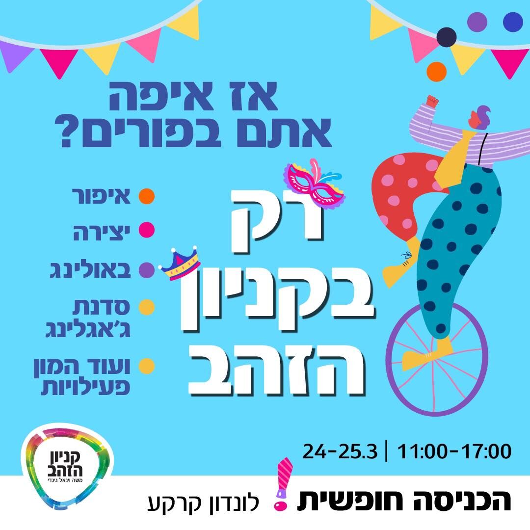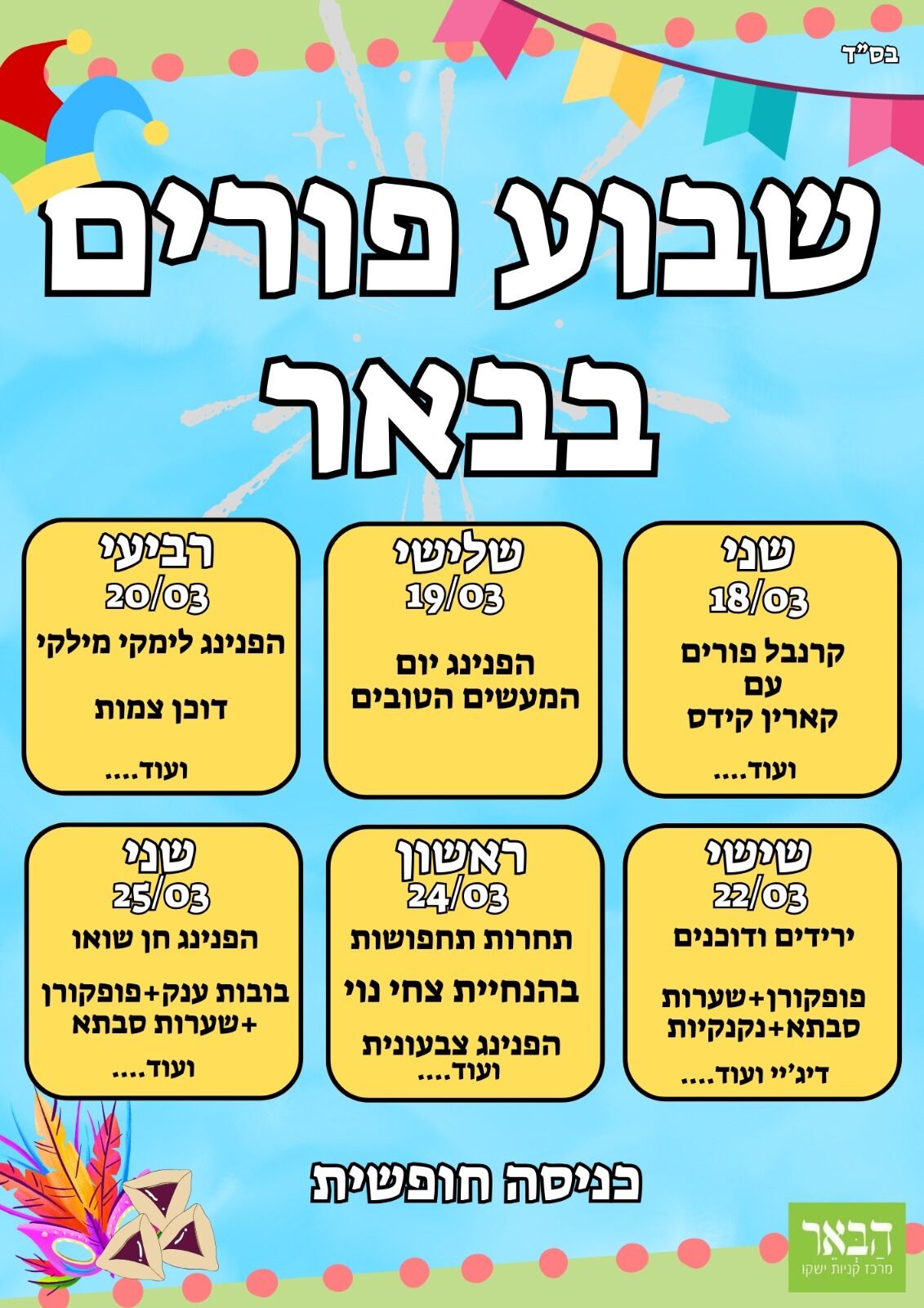 יום ראשון 24.3.24 בשעה 11:30 קריאת מגילה בשעה 12:30 מופע לילדים עם גל הלוליין.