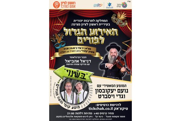 אירוע פורים הגדול של המחלקה לתרבות יהודית ראשון לציון. התושבים מוזמנים למופע עם הכנר הבינלאומי דניאל אהביאל עם מוזיקה שמחה וסוחפת, והמופע הסאטירי 'בשינוי' עם נועם יעקובסון וגדי ויסברט .