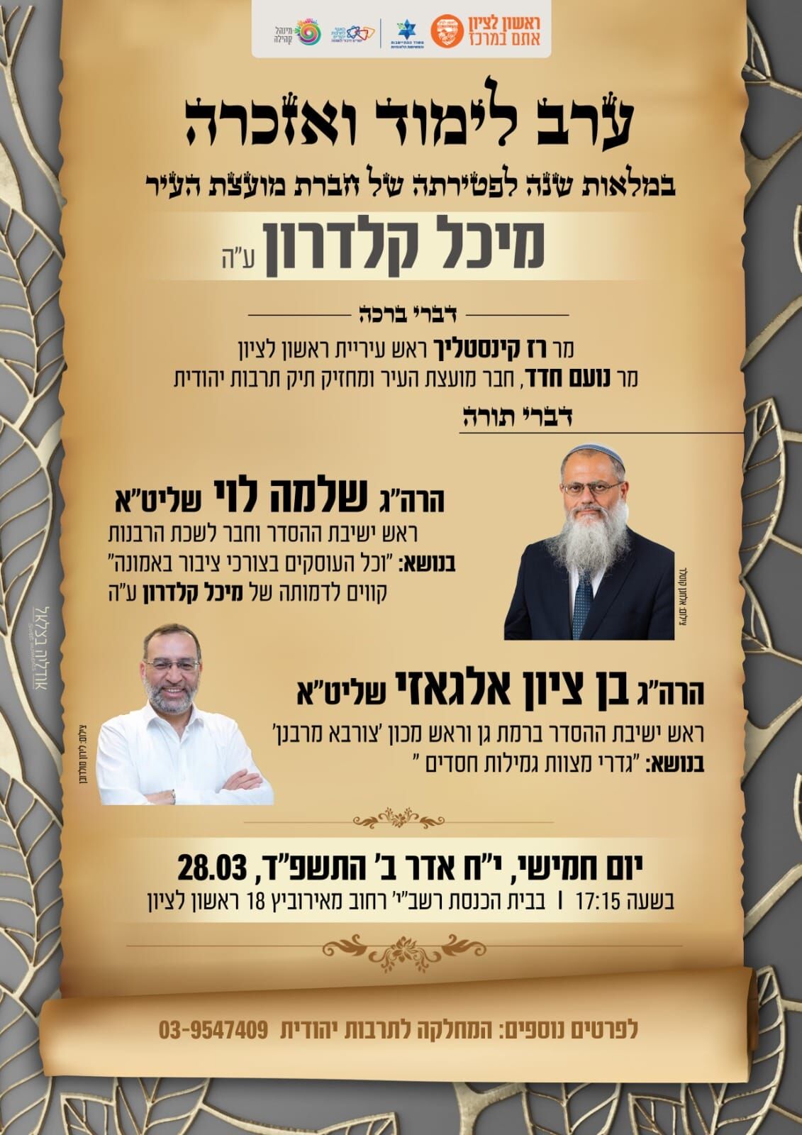 במלאת שנה לפטירתה של חברת המועצה מיכל קלדרון ז"ל, עתיד להתקיים ערב לימוד ואזכרה לזכרה. הערב עתיד להתקיים בישיבת ההסדר בבית הכנסת רשב"י במעמד ראש העיר רז קינסטליך, חבר המועצה נועם חדד, הרב שלמה לוי והרב בן ציון אלגאזי.