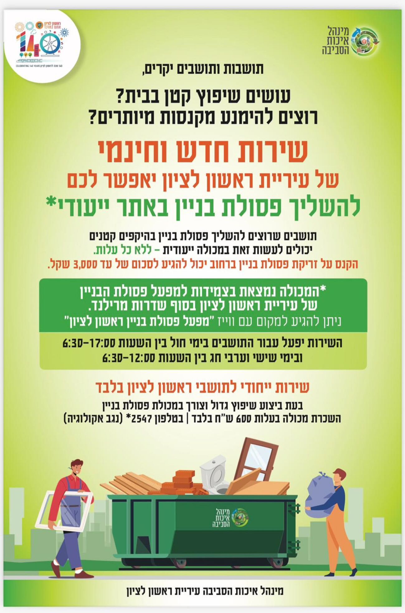 עם תחילת הניקיונות והשיפוצים של פסח עיריית ראשון לציון מזכירה לתושבים המבצעים שיפוצים קטנים בביתם כי יוכלו לקבל שירות השלכת פסולת בניין למפעל הפסולת העירוני בסוף שדרות מרילנד – ללא כל עלות