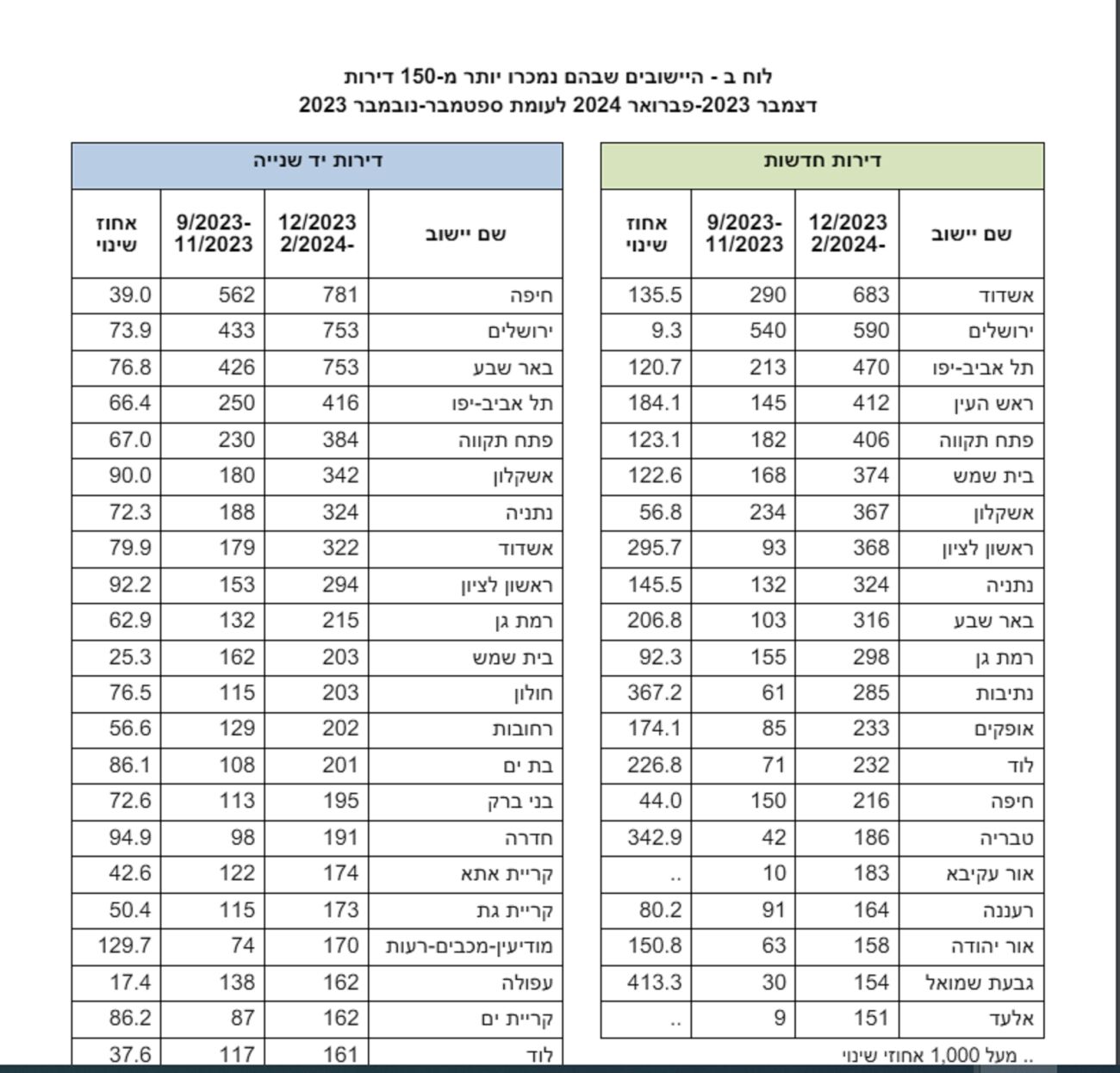 היישובים המובילים במכירת הדירות החדשות הם אשדוד, ירושלים ותל אביב ובמכירת דירות יד שנייה חיפה, ירושלים ובאר שבע.
