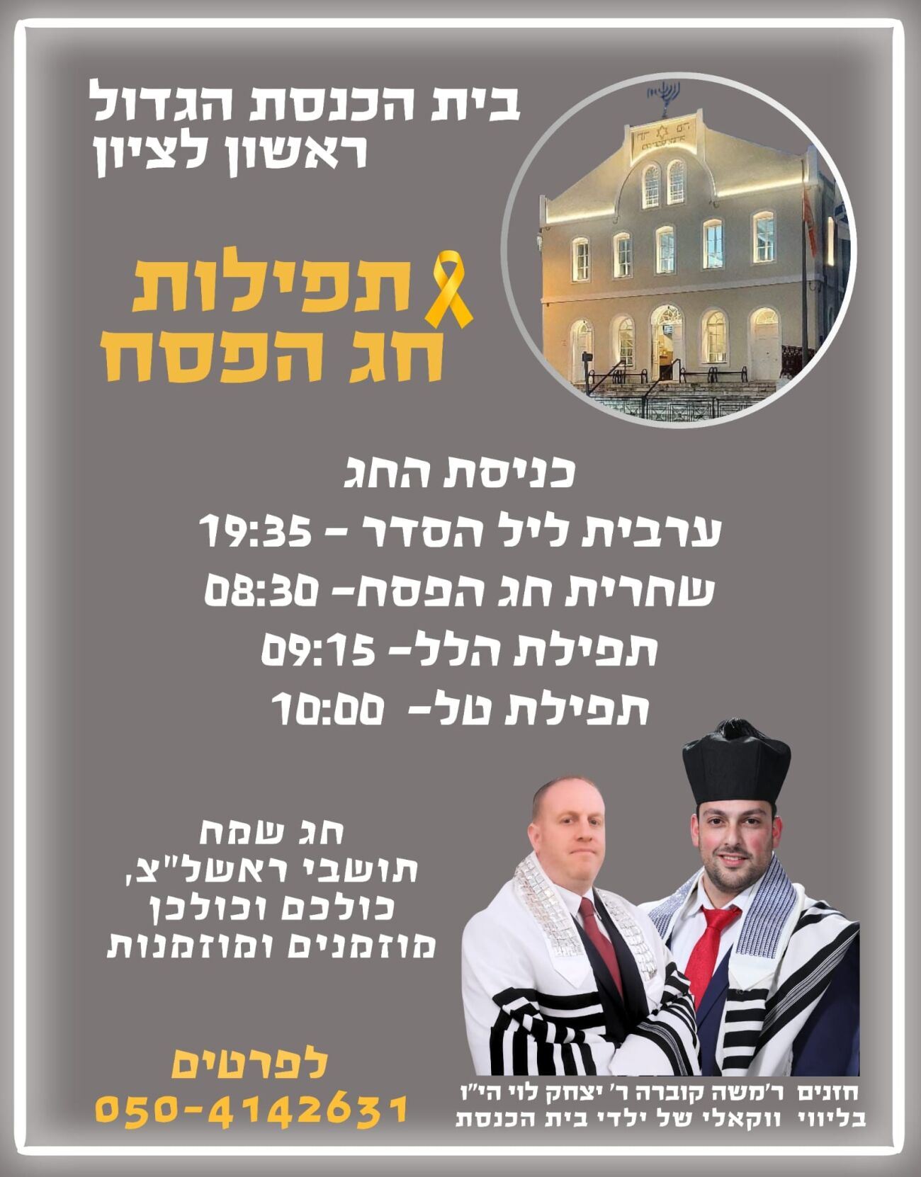 קהילת בית הכנסת הגדול בראשון לציון מזמינים את התושבים להגיע לתפילות חג הפסח שיתקיימו הערב ומחר שני ושלישי 22-23.4