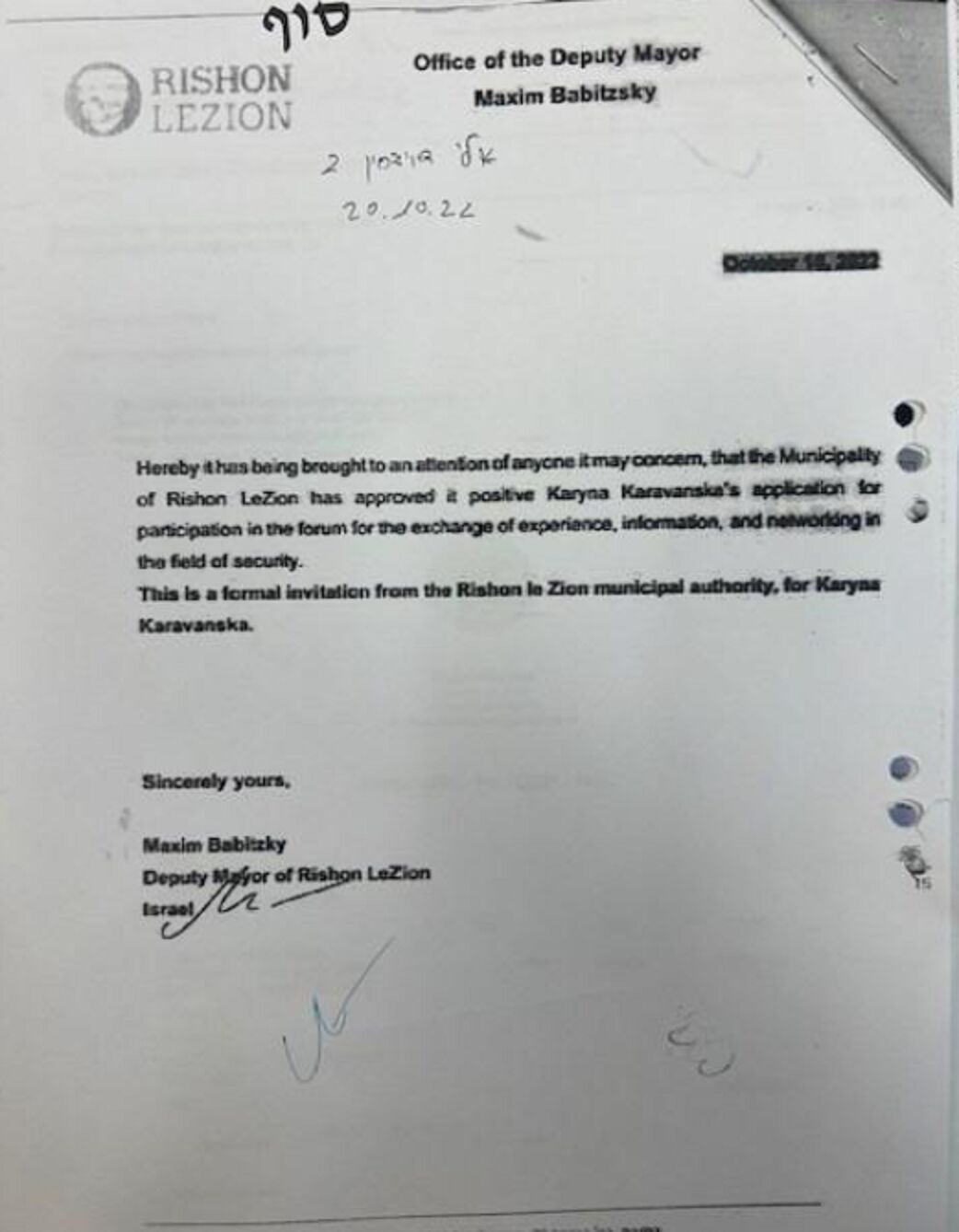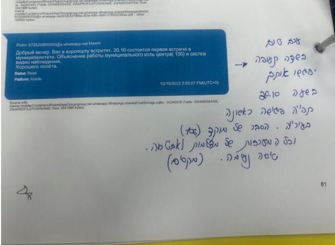 לקראת הגעתה לישראל הוא שלח לה מסרון בו נכתב כי היא מוזמנת לפגישה במוקד העירוני למרות שלא הייתה קיימת כזו פגישה. עם הגעתה לישראל היא עברה תשאול והציגה את המסמכים אך נוצר הרושם כי מסרה מידע לא אמיתי נאסרה כניסתה לארץ.