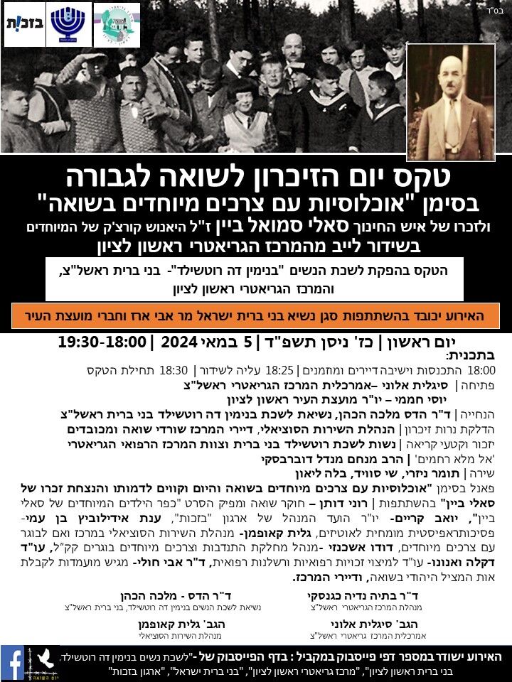 גם השנה תקיים ד"ר הדס-מלכה הכהן נשיאת לשכת בנימין דה רוטשילד בני ברית ראשון לציון ונשות הלשכה בשיתוף הנהלת המרכז הגריאטרי ראשון לציון, אמרכלית המרכז סיגלית אלוני והעובדים- טקס יום הזיכרון לשואה לגבורה מיוחד לזכר האוכלוסיות עם הצרכים המיוחדים ולזכרו של סאלי ביין איש החינוך שהיה היאנוש קורצ'ק של האוכלוסיות עם הצרכים המיוחדים.