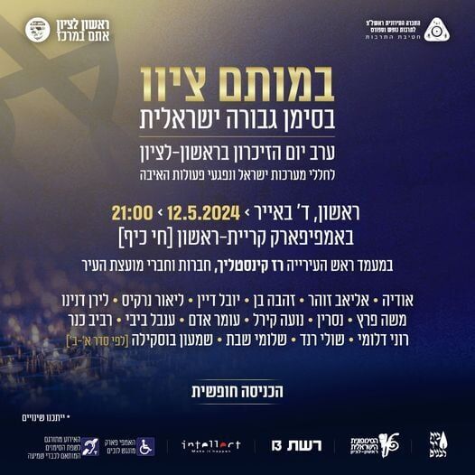 טקס יום הזיכרון בראשון לציון, באמפיפארק קריית ראשון, בהשתתפות: אודיה, שלומי שבת, עומר אדם, נועה קירל, ליאור נרקיס, משה פרץ, נסרין, אליאב זוהר, זהבה בן, יובל דיין, לירן דנינו, ענבל ביבי, רביב כנר, רוני דלומי, שולי רנד, ושמעון בוסקילה.. כניסה חופשית