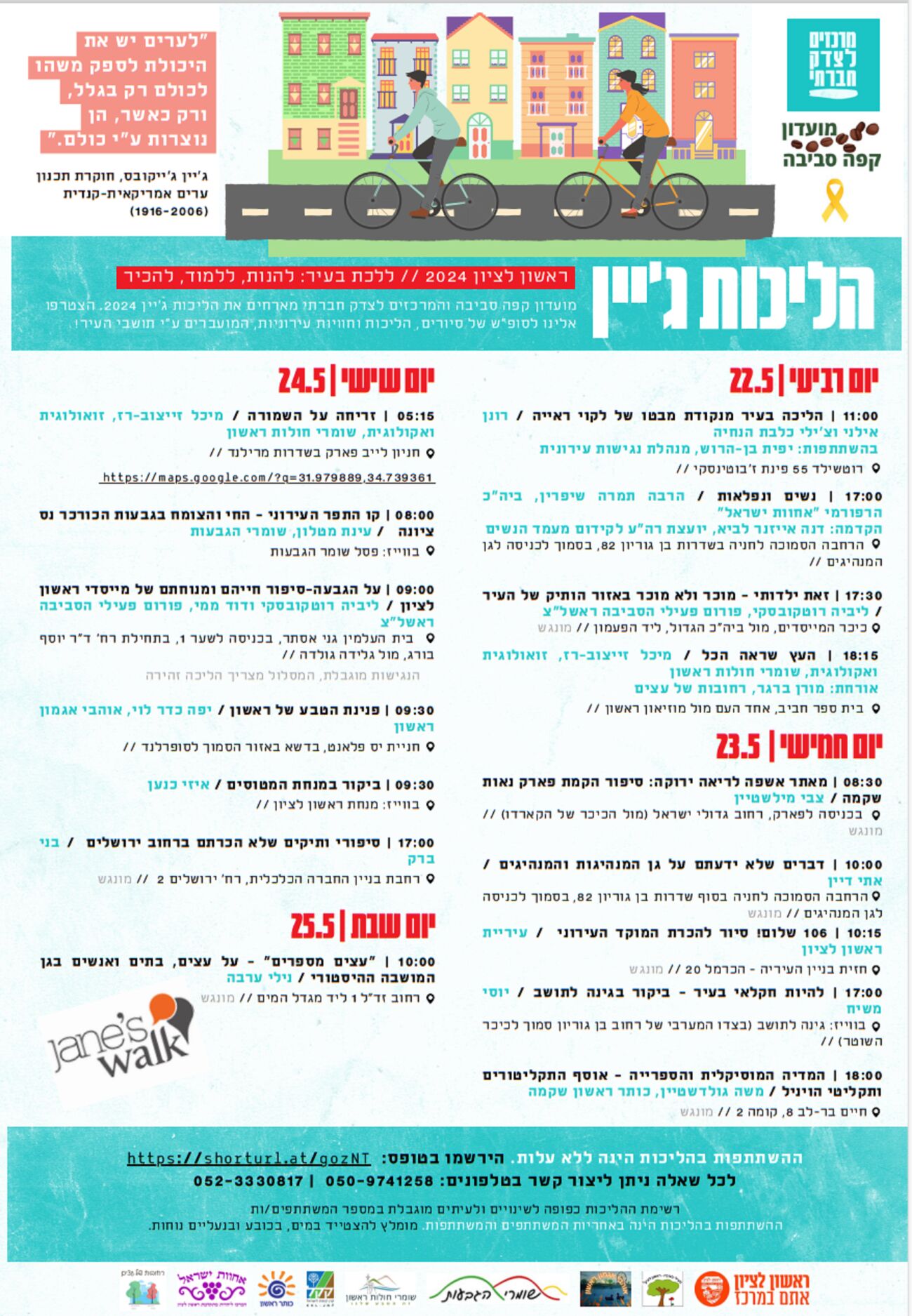 מועדון קפה סביבה והמרכזים לצדק חברתי מארחים את הליכות ג`יין 2024 בראשון לציון ומזמינים את התושבים להליכות וחוויות עירוניות, המועברים, ללא תשלום, ע"י תושבי העיר שיתקיימו בעיר בסוף השבוע הקרוב 22-25.5.24