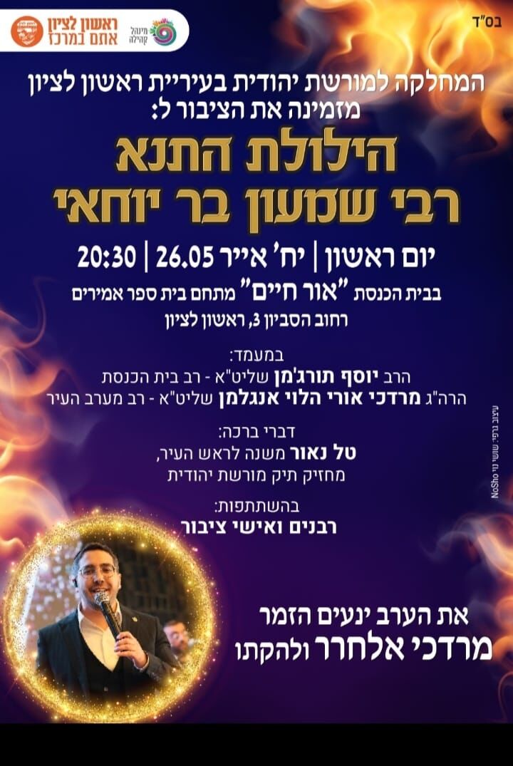 היום ראשון 26.5 תתקיים הילולת רבי שמעון בר יוחאי בבית כנסת אור החיים ברחוב הסביון 3 - מתחם בתי ספר אמירים עם מופע של מרדכי אלחרר ולהקתו