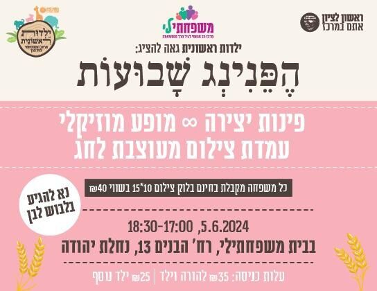 משפחתילי מבית ילדות ראשונית בעיריית ראשון לציון ,מזמין אתכם.ן להפנינג שבועות לכל המשפחה!