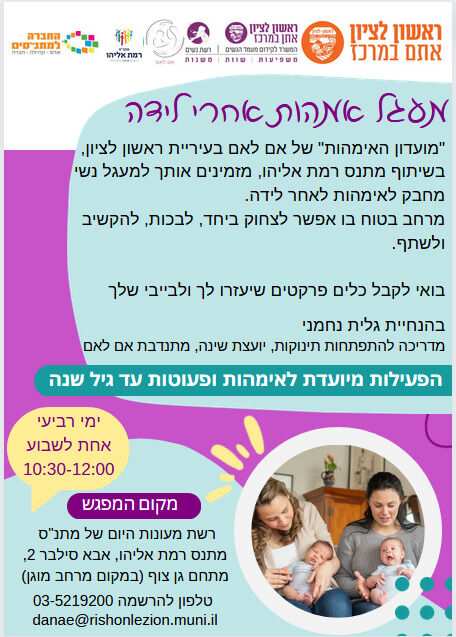 אימהות לאחר לידה בראשון לציון מוזמנות להצטרף למועדון אם לאם במתנ"ס רמת אליהו ושיכון המזרח שילווה אתכן וייתן לכן כלים בנושא התפתחות תינוקות עוד