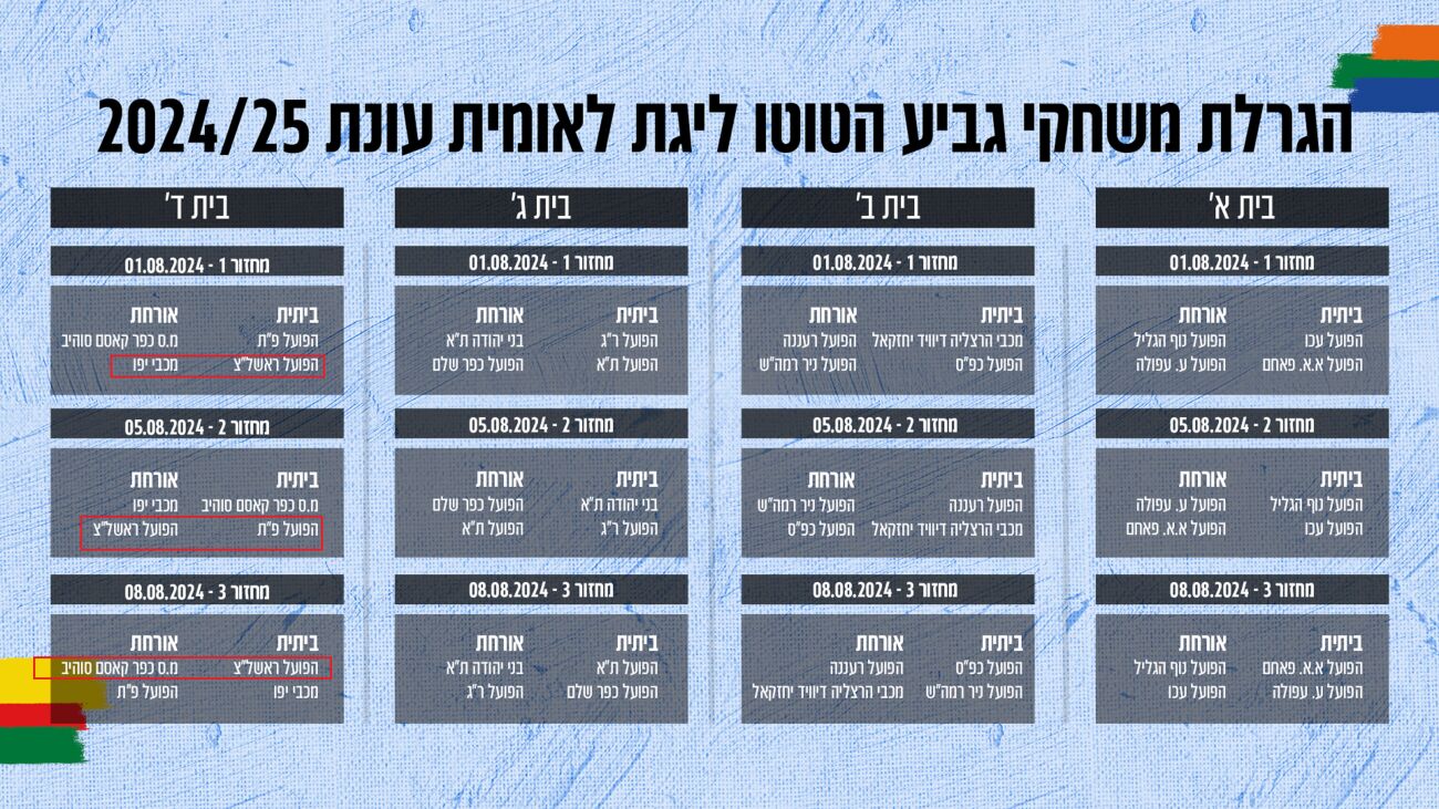 מנהלת הליגות בכדורגל פרסמה את לוח משחקי ליגת העל, הליגה הלאומית וגביע הטוטו שייפתחו בחודש אוגוסט 2024. הפועל ראשון לציון שניצלה מירידה תפתח את עונת 2024/25 ב1.8 מול מכבי יפו במסגרת משחקי הבתים של גביע הטוטו. במחזור הראשון של הליגה הלאומית היא עתידה לפגוש את הפועל תל אביב שירדה מליגת העל.
