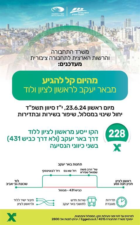 חברת אגד הודיעה על שינויים במסלול קו 228 הנוסע מראשון לציון ללוד מעתה הוא יעבור דרך באר יעקב ולא דרך 431