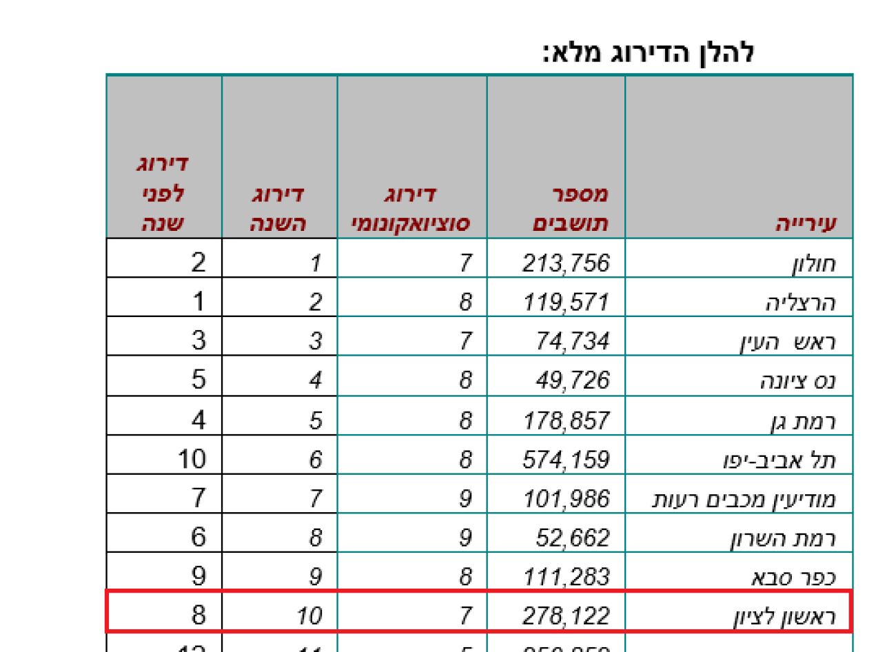 כאמור ראשון לציון נמצאת במקום העשירי בדירוג העיריות ירידה של שני מקומות לעומת הדירוג לפני שנה. חולון תפסה את המקום הראשון, הרצליה את השני וראש העין את השלישי.