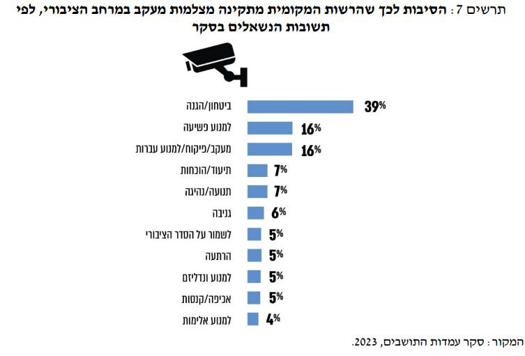 כאשר נשאלו התושבים (בכל הרשויות) מהן הסיבות להתקנת המצלמות 3 הסיבות העיקריות היו ביטחון (39%), למניעת פשיעה, מעקב, פיקוח, ולמנוע עבירות (17%) ותיעוד הוכחות (7%).