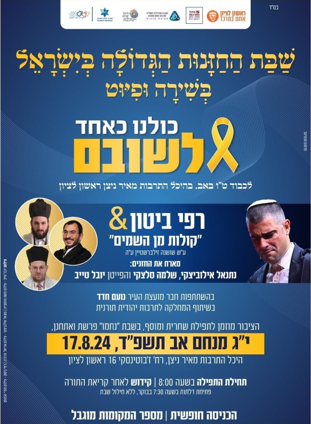 החל משעה 8:00 תתקיים שבת חזנות בהיכל התרבות ראשון לציון עם רפי ביטון, קולות מן השמים, נתנאל אילוביצקי, שלמה סלצקי ויובל טייב.