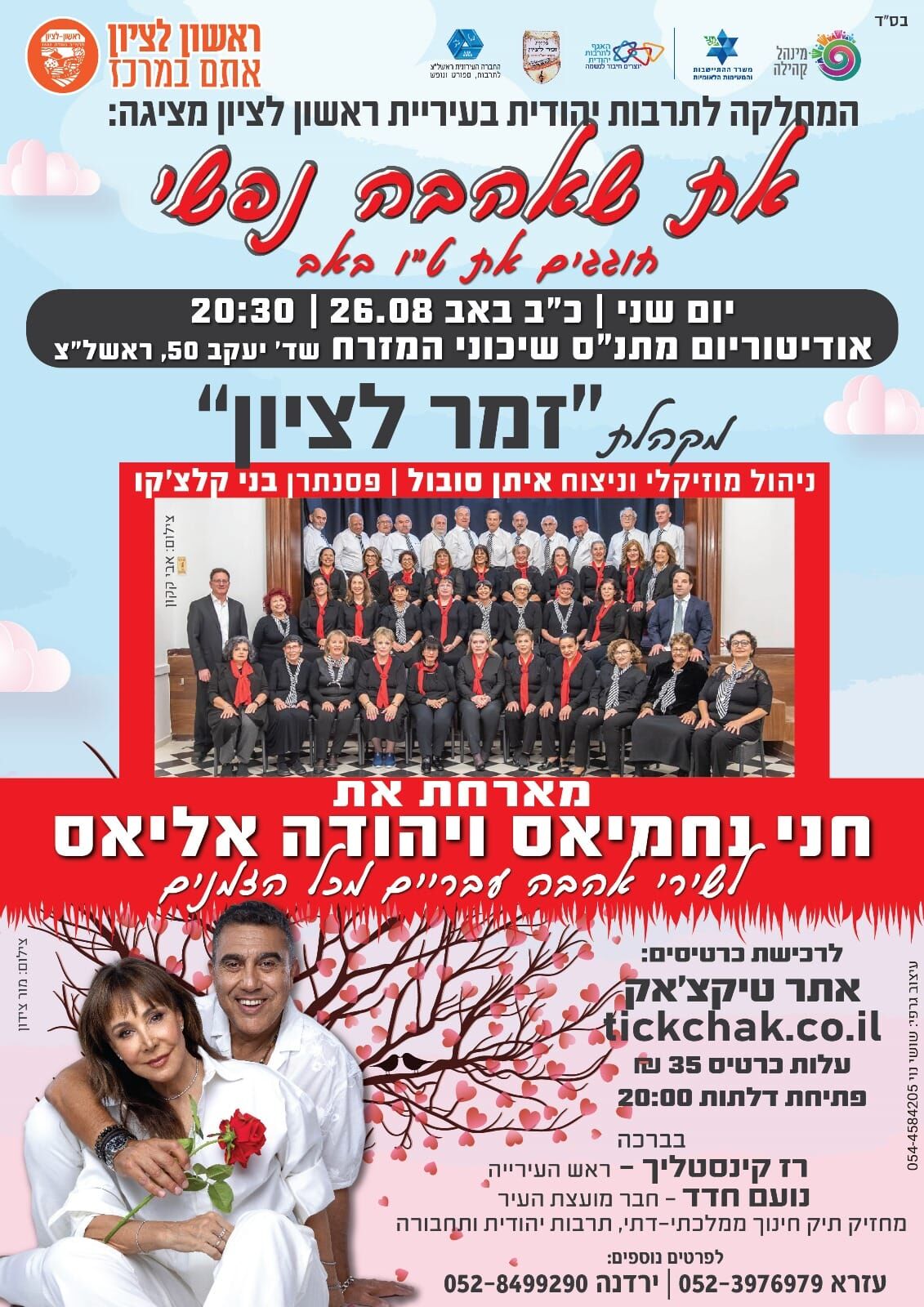 יום שני 26.8 שעה 20:30 מופע להקת זמר לציון המארחת את חני נחמיאס ויהודה אליאס