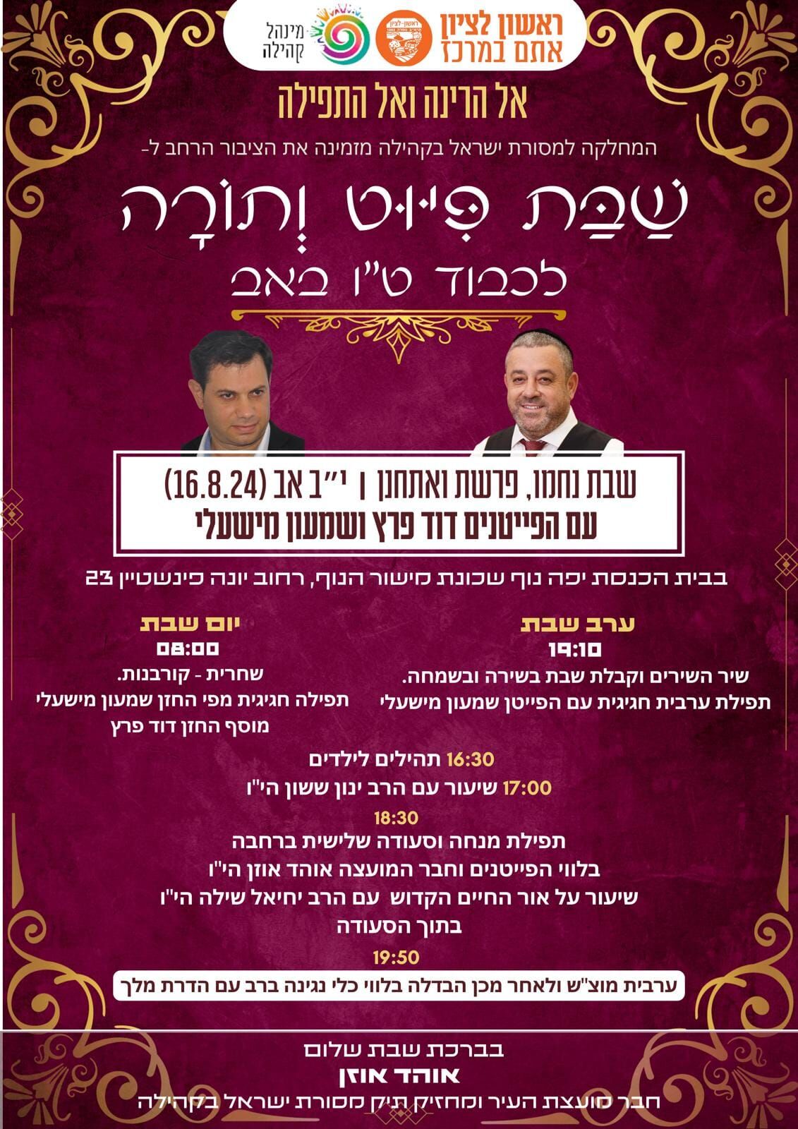 שבת נחמו בבית הכנסת יפה נוף ברחוב יונה פינשטיין 23 עם הפייטנים דוד פרץ ושמעון מישעלי