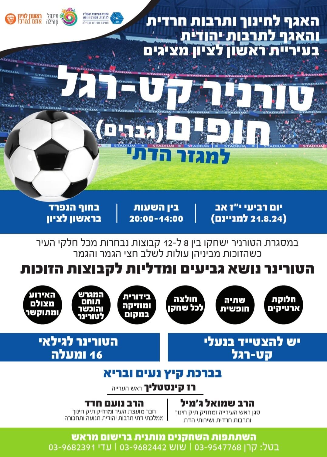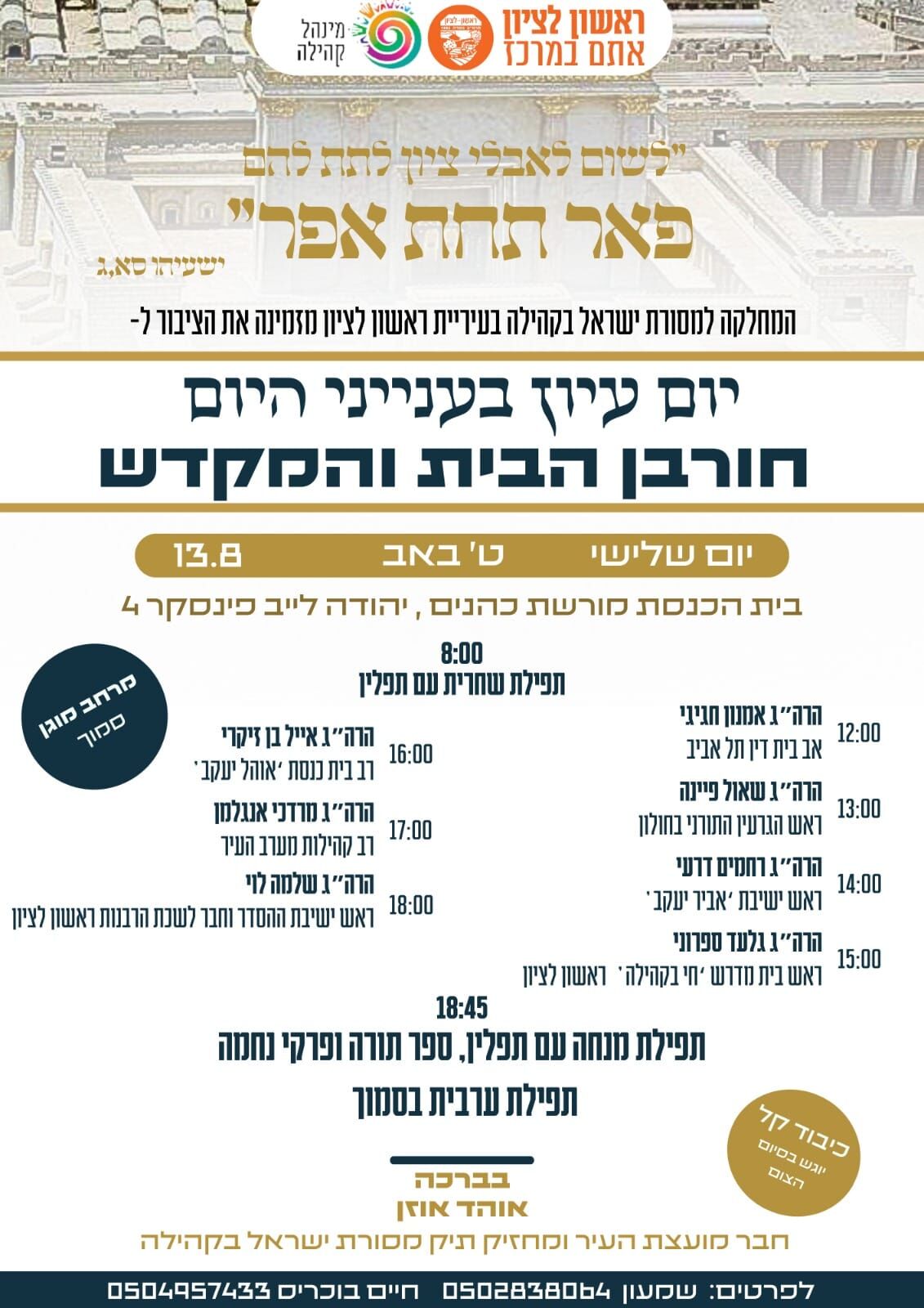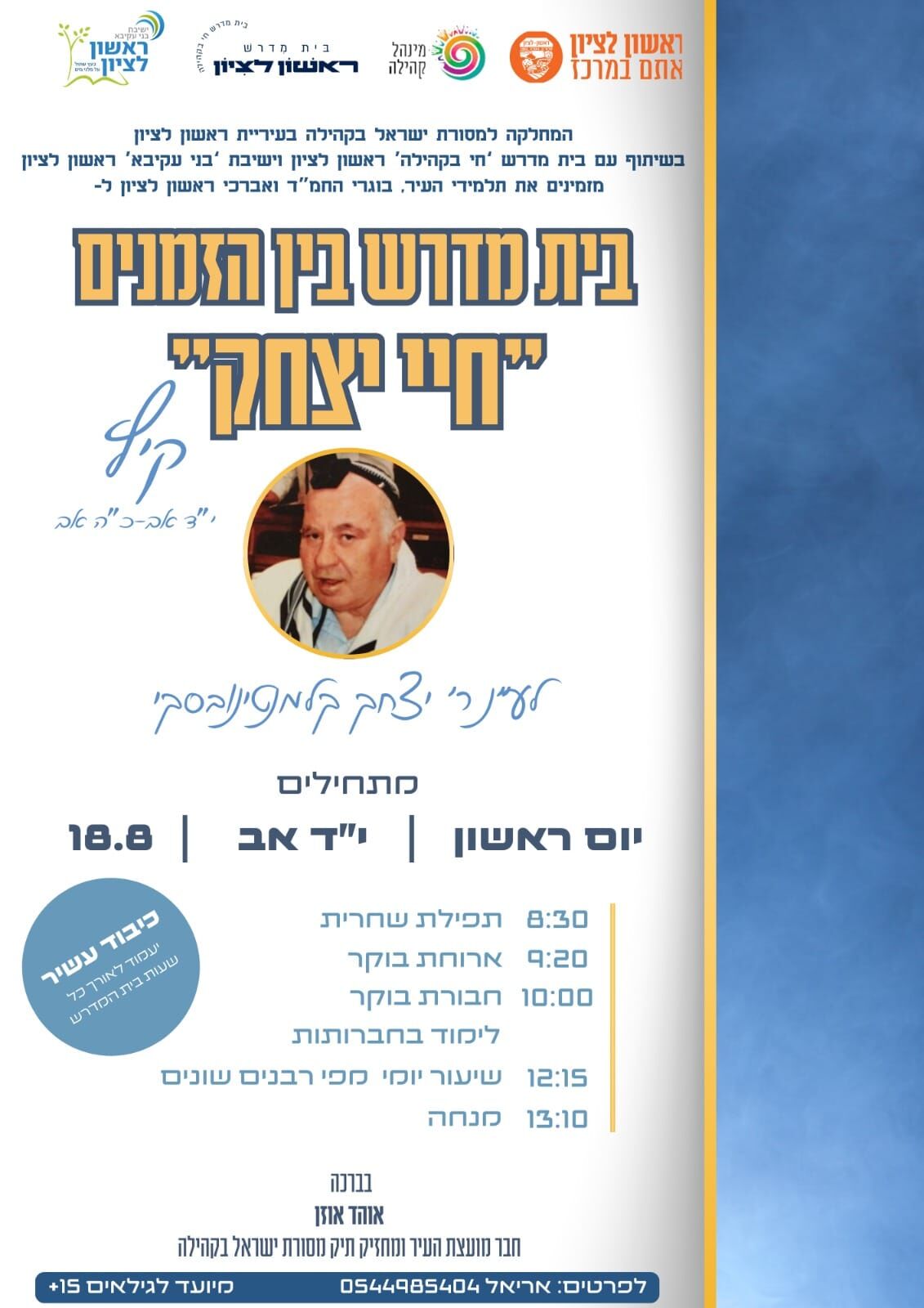 עיריית ראשון לציון והמחלקות לתרבות יהודית ומסורת ישראל מזמינות את התושבים לשלל אירועי חודש אוגוסט שיתקיימו ברחבי העיר ומותאמים לציבור הדתי. התושבים יוכלו ליהנות מימי עיון, שבת חזנות, ימי כיף בבריכה, מופע של חני נחמיאס ויהודה אליאס, אירועי טו באב ועוד ועוד.