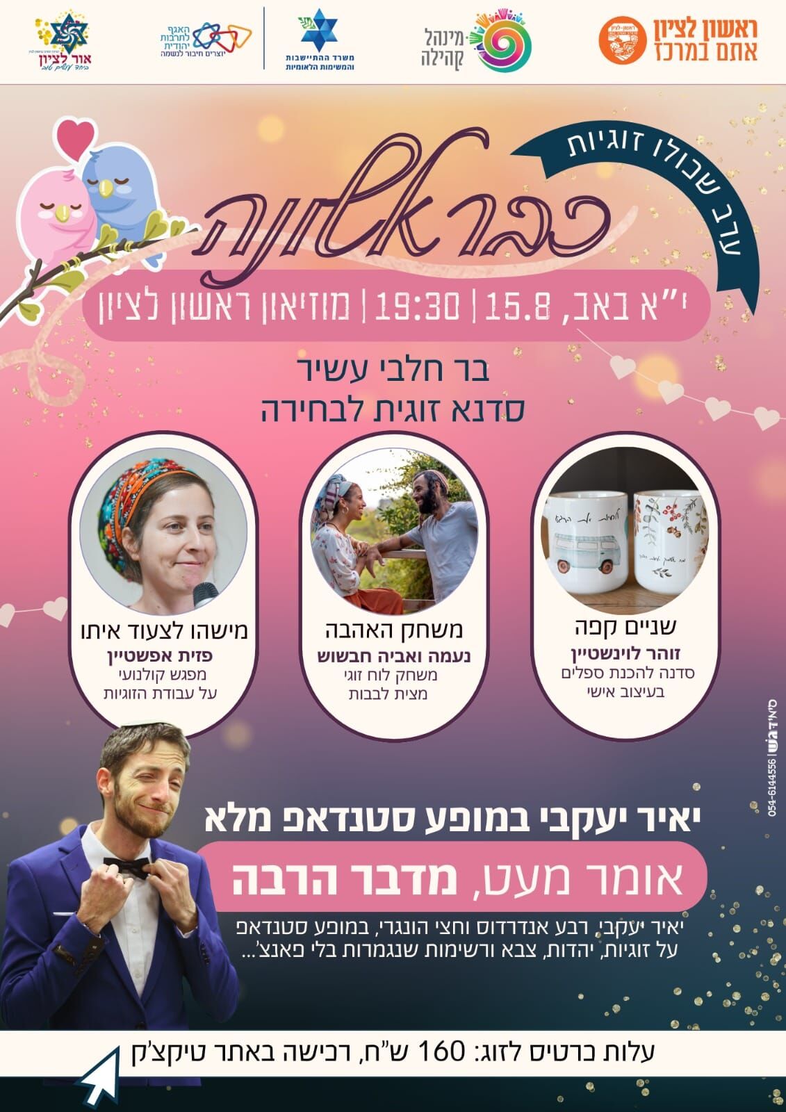 בשעה 19:30 יתקיים במוזיאון ראשון לציון ערב שכולו זוגיות עם מופע סטנדאפ של יאיר יעקובי, בר חלבי עשיר, וסדנה זוגית לבחירה: סדנה להכנת ספלים בעיצוב אישי, משחק לוח זוגי, מפגש קולנועי על עבודת הזוגיות