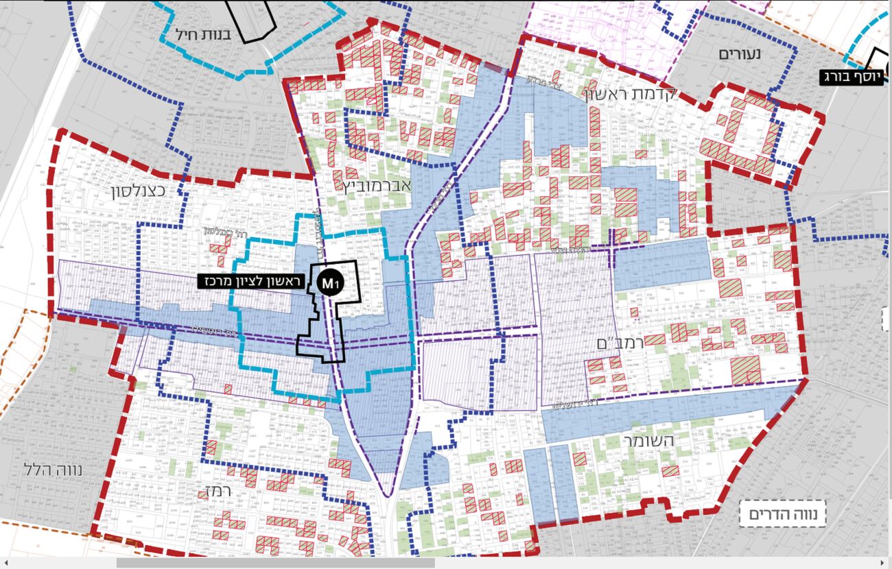 הסימון האדום הוא האזורים בהם יש מבנים פוטנציאלים להתחדשות עירונית