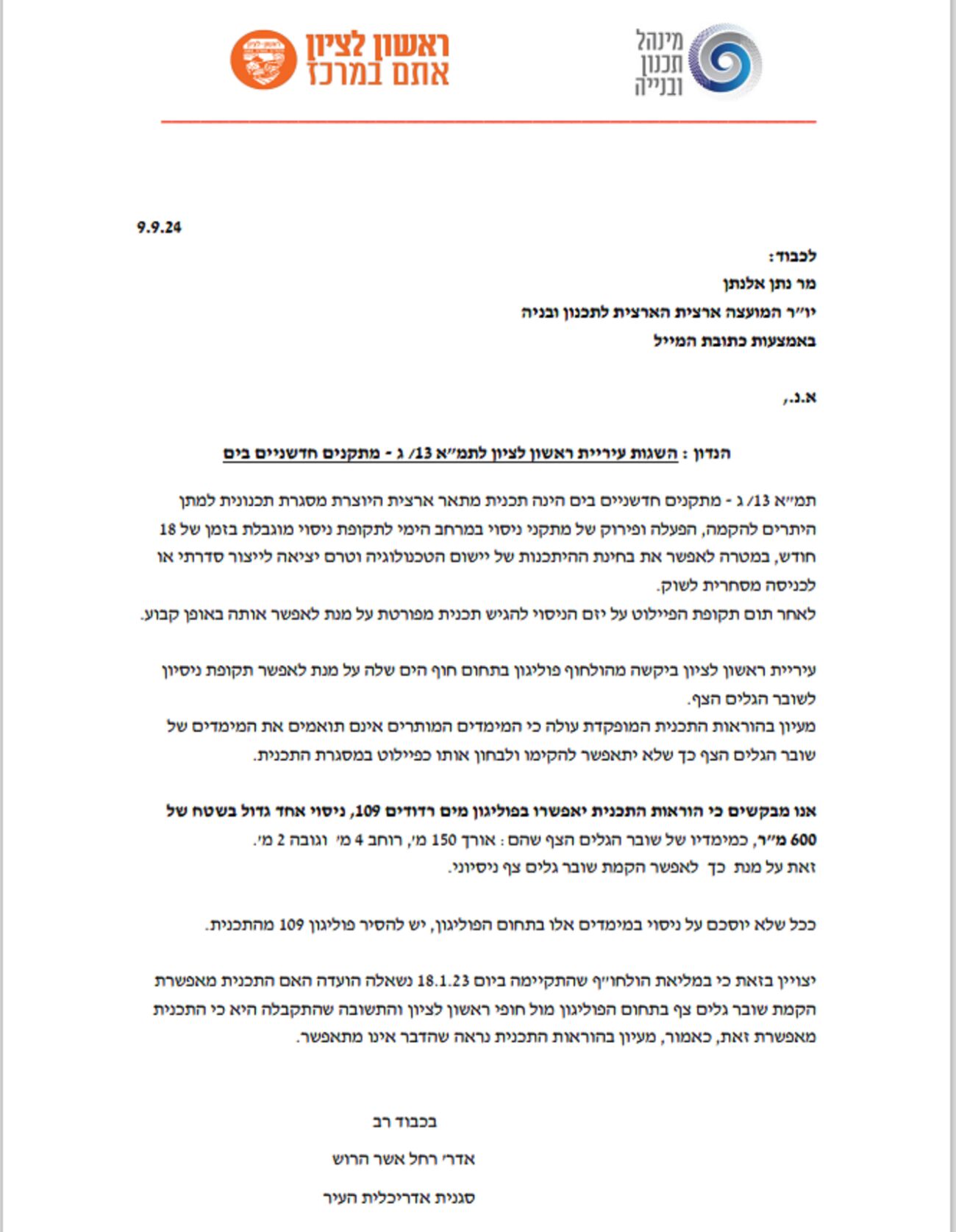 עוד טוענת העירייה כי בחודש ינואר 2023 בישיבה עם ההול"חוף נמסר לה כי התוכנית תאפשר הקמת שובר גלים צף בתחום השטח המאושר מול חופי ראשון לציון, אך כאשר מסתכלים על התוכנית נראה כי הדבר לא מתאפשר.