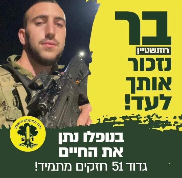 לוחם גולני סמל בר רוזנשטיין ז"ל מראשון לציון נהרג בלחימה בעוטף עזה